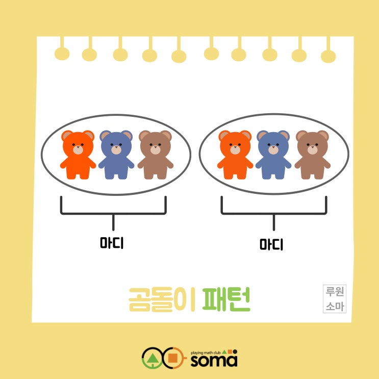 안녕하세요 ~ 루원소마입니다. 이번 수업 시간에는 규칙을 발견하는 힘을 기를 수 있는 패턴 수업을 진행하였습니다. 루원소마의 패턴 수업은 단순히 반복을 맞히는 활동이 아니라 '패턴의 마디(반복되는 가장 작은 단위)'를 정확히 이해하는 수업입니다. 많은 아이들이 패턴을 눈으로만 맞히거나 눈에 보이는 것만 따라가며 정답을 찾습니다. 우리 루원소마 친구들은 여기서 한 단계 더 나아갑니다. '어디까지가 한 번의 반복일까?' 이 패턴의 가장 작은 묶음은 무엇일까?" 루원소마 패턴 사고력 수업은 '왜 그렇게 되는지' '어떤 규칙이 숨어 있는지' 를 생각하게 합니다. 색깔, 모양, 크기 등 겉....... <img src="https://blogthumb.pstatic.net/MjAyNjAyMTlfNzMg/MDAxNzcxNDc5OTczNjc1.jcN3iwk_tnlY4F0BE_LWP35qL4sb6AwH5McPC7_sPH4g.36d4tAZOW9mJa592jAiHWW2PYL-9SBpWhU2_Q4JpVPsg.JPEG/%C7%D0%BD%C0-%C0%CC%BE%DF%B1%E2_%BA%B9%BB%E7%BA%BB-017.jpg?type=s3" />
