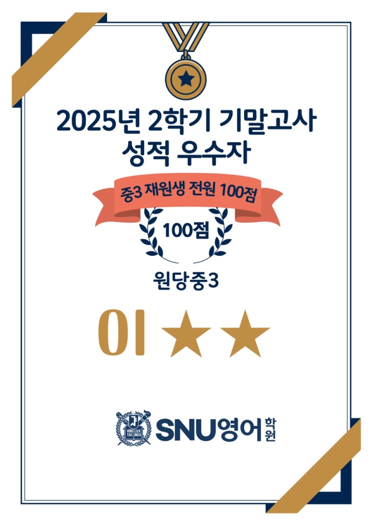 매년 특목 자사고 입시를 위해 타 학년보다 일찍 기말을 치르는 중3들 그래서 겨울에 접어드는 늦가을부터 학원들은 끊임 없이 시험대비 중입니다 ㅎㅎㅎ 물론 저희 SNU영어도 예외는 아닙니다. 이번 2학기 중간고사가 마무리 되자 마자 바로 3학년 기말 준비에 돌입했습니다. 그 결과 전원 만점이라는 행복한 결과가 나왔습니다. 특히나 올해 초 광고도 안 하는 SNU영어와 저를 믿고 와준 ㄱㅁ이 덕에 우리 중3반이 생길 수 있었는데 1학기 중간, 기말, 2학기 기말 모두 마무리 해주었네요. 늘 열심히인 ㅎㅇ이는 저번 시험에서 아쉽게 하나 틀렸는데 이번 시험에서 반에서 유일한 만점으로 기말을 마무리하였습니다. 또 꼭 만점을 받겠다는 야....... <img src="https://blogthumb.pstatic.net/MjAyNTExMjZfNDcg/MDAxNzY0MTM4MDIxMDAx.JR_F1Cjuy9nahRofUKhd4kTKbWTBSEKYHAR79SnUbQ8g.bDN3nALFbbol33FKTvdJWhVWkEmgnFg7FoFRF13-knIg.JPEG/900%A3%DF003.jpg?type=s3" />