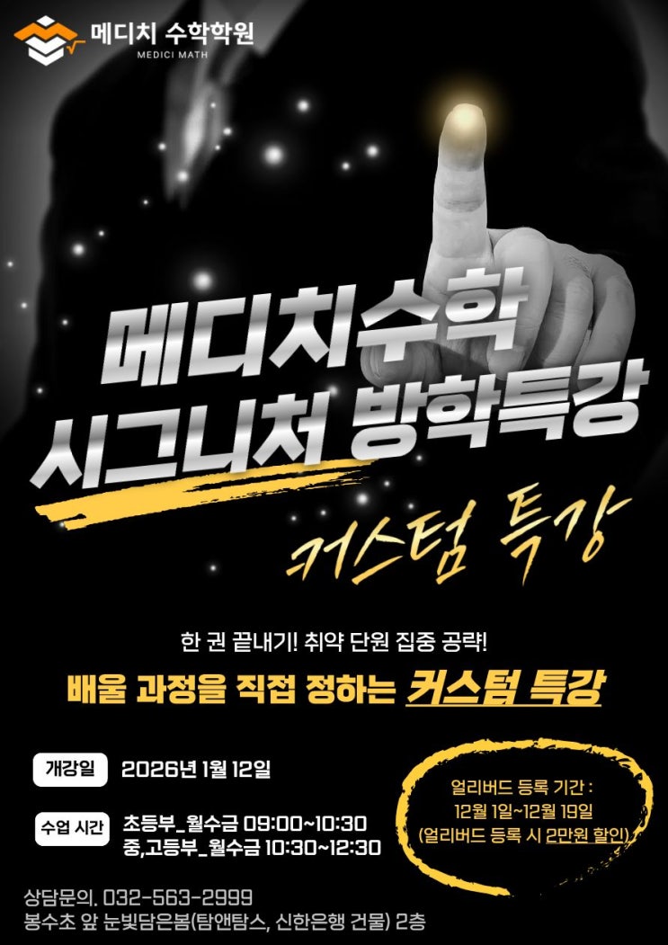 겨울방학, ‘따라가는 공부’가 아닌 ‘완성되는 과정’ 12회 커리큘럼 커스텀 특강 안녕하세요, 구희선 원장입니다.^^ 메디치 수학학원의 겨울특강은 정확히 푸는 힘, 깊게 생각하는 힘, 끝까지 완성하는 힘. 메디치는 이 세 가지를 12회 과정 속에 학생 맞춤으로 담아냅니다. 학생마다 필요한 범위가 다르지만, 완성의 기준은 같습니다. 방학이면 고민이 많아지죠. “수업을 어디까지 진도 나가야 하나?” “이번 학기 약점만 해결해야 하나?” “한 학원 커리큘럼이 늘 정해져 있어서 답답한데…” 메디치는 이렇게 말합니다. ✅ 12회로 끝내면, 끝납니다. ✅ 학생의 필요 기준으로 설계하면, 효과가 다릅니다. ✅ 과정을 따라만 가....... <img src="https://blogthumb.pstatic.net/MjAyNTEyMDRfMjQx/MDAxNzY0Nzc2MDUzNTE5.k0Rcto0-ScG18Ugq4vU1gn54KYda8zJHQz8_GoUH26gg.qkAb_A-wkUoSziPQ0CLUAdpNbRS1gIXGPXiWRdcI70og.JPEG/%BC%F6%C7%D0%C4%BF%BD%BA%C5%D2%C6%AF%B0%AD.jpg?type=s3" />
