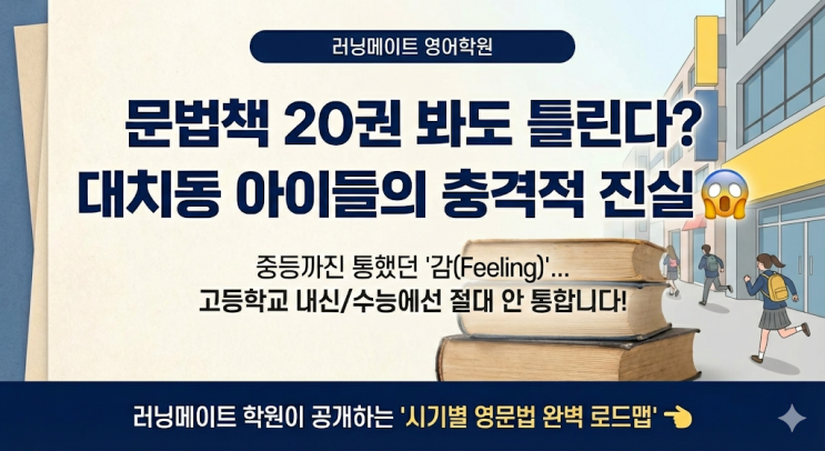 안녕하세요, 러닝메이트 학원입니다. 대치동 아이들, 공부 정말 많이 하죠. 중학교 2~3학년 아이들에게 물어보면 태어나서 본 문법책이 20권은 넘는다고 말합니다. 그런데 아이러니하게도 정작 시험을 보면 문법 문제를 틀리는 경우가 태반입니다. 왜 그럴까요? 이유는 간단합니다. ‘감’으로 풀기 때문입니다. 초등 때부터 쌓아온 독서량으로 대충 읽어보면 ‘이게 답인 것 같은데?’ 하는 느낌이 오거든요. 하지만 고등학교 내신과 수능은 그 ‘느낌’만으로는 절대 해결되지 않습니다. 오늘은 우리 아이가 고등학교 입학 전, 영문법을 완벽하게 끝내는 시기별 로드맵을 공개합니다. 1. 문법은 ‘영어의 사칙연산’과 같습니다. 수학으로 비유....... <img src="https://blogthumb.pstatic.net/MjAyNTEyMDhfNzAg/MDAxNzY1MTk0MDczMzc0.UdJkMGh_LyMCNn8pz_U04o8zbIc5c3xi4KT2sNSybh0g.Vr-W-_CDYdOtXPdclOXFxYlSi6RTA2qcoWIfBDVfkSog.PNG/image.png?type=s3" />