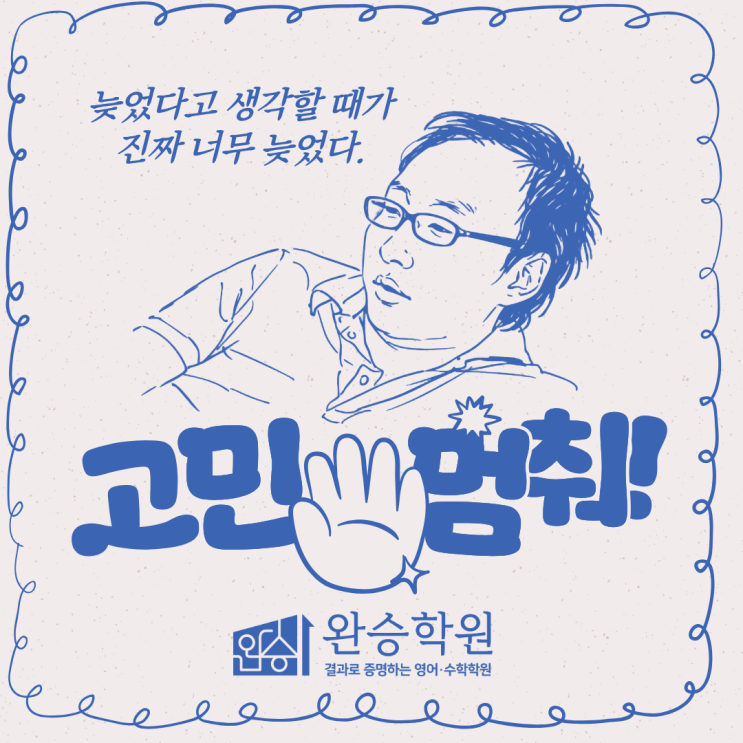 안녕하세요. 청라 중·고등영어 전문, 완승학원입니다! 드디어 기다리고 기다리던 개학이네요! 다들 새로운 친구들 사귀느라 바쁘고, 학교 분위기도 들떠 있을 시기일 것 같아요ㅎㅎ "적응 좀 하고 시작하자", "아직 학기 초니까 괜찮겠지" 라며 다들 여유를 부리는 시기이기도 합니다. 하지만 냉정하게 말씀드리겠습니다..! 제가 가장 공감하는 무한도전의 명언이 하나 있는데요. 늦었다고 생각할 때가 진짜 너무 늦은 거다. 그러니 지금 당장 시작해라. 보통은 '늦었다고 생각할 때가 가장 빠르다'며 위로하곤 하죠. 그 위로에 안심하고 뒤늦게 허둥지둥 책장을 넘기기 시작합니다. 하지만 냉정한 입시....... <img src="https://blogthumb.pstatic.net/MjAyNjAzMDdfMjA2/MDAxNzcyODg1MzI3Nzcw.JbLUbEY4EsrjmpJDGkBG9Z5NWcoqgHwlsHnII_9aKZwg.31UJ6gPyQpFsnMYjv23y8hR_RPXsWgdsNEiIU-4qgRIg.PNG/%C1%A6%B8%F1%C0%BB_%C0%D4%B7%C2%C7%D8%C1%D6%BC%BC%BF%E4._%282%29.png?type=s3" />