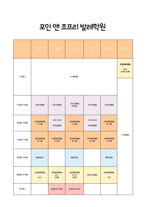 안녕하세요 포인 앤 조프리 발레학원입니다:) 시간표 참고해 주시고 모든 수업은 수강 인원 3명 이상 시 오픈합니다. 방문 상담은 미리 네이버 톡 톡으로 연락 남겨주세요! 상담문의 010 8692 4056 카카오톡 Poin_joffery <img src="https://blogthumb.pstatic.net/MjAyNTExMTlfODYg/MDAxNzYzNTQ2NTU0Njg3.LU071vlHEabn9webnlHWhs0CvUgXCdBy1XO8DPpJEEMg.mz0z5VoCWZzQX9Qa73pbdKSRo7DP8aE0bUFUWd52-QAg.JPEG/1.jpg?type=s3" />