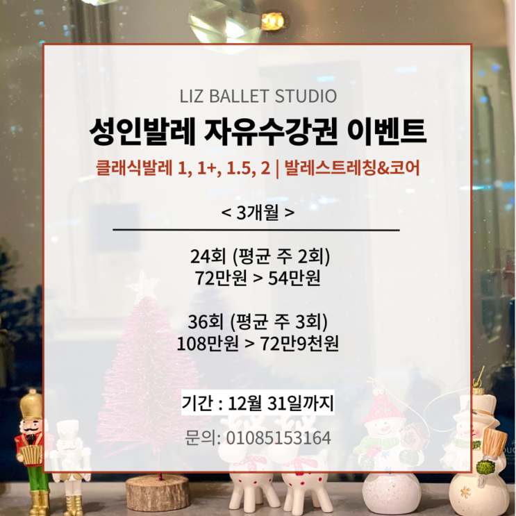 인천 청라 발레학원 리즈발레스튜디오 문의: 010-8515-3164 카카오채널: 청라리즈발레스튜디오 주소: 청라한내로 72번길 7-29, 골드클래스 B동 3층 (주차 가능) 부드럽게 한 해를 마무리하고, 새해 준비를 예쁘게 시작해요 ✨ 안녕하세요, 리즈발레스튜디오입니다 12월 한 달 동안 성인발레 회원님들을 위해 특별 자유수강권 이벤트를 준비했습니다! 발레를 꾸준히 배우고 싶지만 시간표에 맞추기 어려우셨던 분들, 주 몇 회로는 부족하셨던 분들께 추천드리는 구성이에요. 12월 자유수강권 혜택 ✔️ 스케줄에 맞춰 자유롭게 수강 가능 ✔️ 클래식 1, 1B, 1+, 1.5, 2, 코어·스트레칭 등 모든 성인 수업 참여 가능 ✔️ 레벨에 맞춰 자....... <img src="https://blogthumb.pstatic.net/MjAyNTEyMDFfMjkz/MDAxNzY0NTc3MzY0ODc3.g_GplcGZg0U9PaSNkKnVQeBn9fhCG792rxVncoFTSG0g.2CaAX9M1ClnC3NwGm8sk95IkqzfbjXeUhokj45ljtAMg.PNG/IMG%A3%DF9457.PNG?type=s3" />