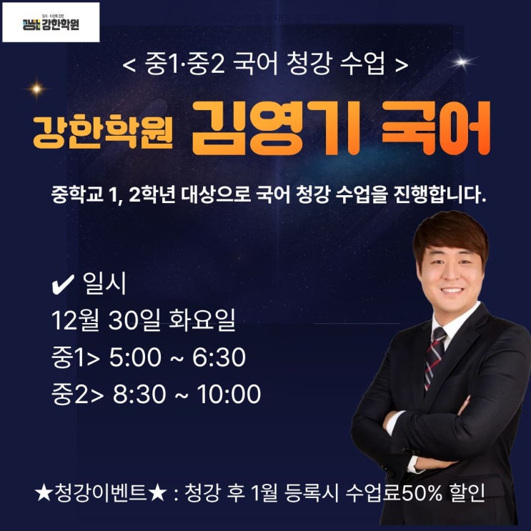 < 중1·중2 국어 청강 수업 안내> 안녕하세요. 강한학원입니다.^^ 국어 학습에 관심 있는 학생과 학부모님들을 위해 중학교 1·2학년 대상으로 국어 청강 수업을 준비했습니다. ✔ 일시 12월 30일 화요일 중1> 5:00 ~ 6:30 중2> 8:30 ~ 10:00 <수업 후 개별 상담 가능합니다.> ★청강이벤트★ : 청강 후 1월 등록시 수업료50% 할인 학생들의 국어 실력 향상에 도움이 될 수 있도록 알차게 준비했습니다. 많은 관심과 참여 부탁드립니다! https://naver.me/GUmg9Dgl <img src="https://blogthumb.pstatic.net/MjAyNTEyMDVfMjI1/MDAxNzY0OTI0MTY4MDA0._txvd4eslphlsngqRVc0vLaUpB2u5RV9DMqhLp-KvBwg.39mW3n2IJa9QjF7dcQVfijD5WjgKNZybfmV3gSNWX3Qg.JPEG/%B1%E8%BF%B5%B1%E2%B1%B9%BE%EE_%C3%BB%B0%AD%B0%F8%C1%F6.jpg?type=s3" />