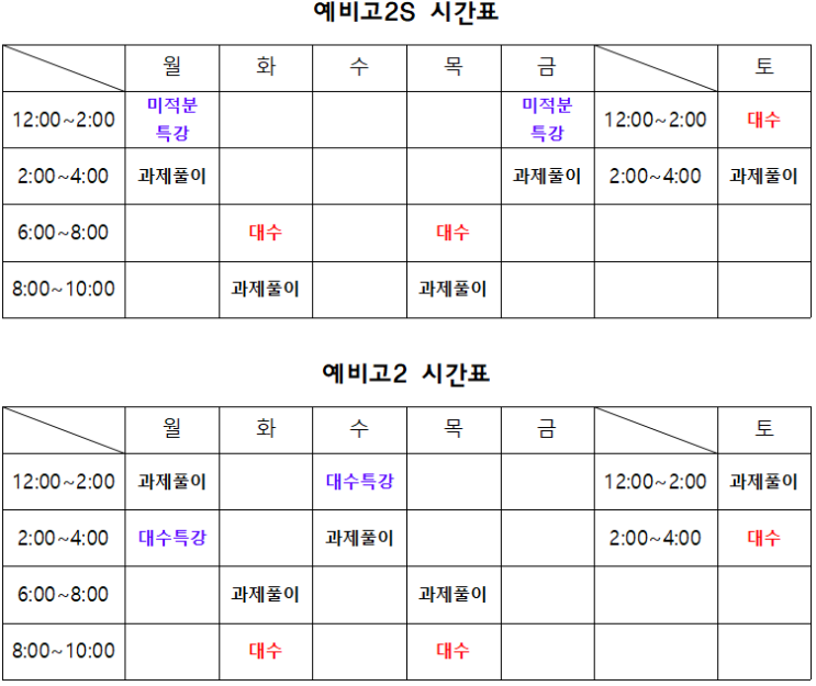2026학년도 입시 대비 겨울방학 예비고2 시간표 마전동 소수정예 수학 '이쌤수학'입니다. 어느덧 기말고사가 마무리되고, 예비 고2 학생들에게 가장 중요한 시기인 '겨울방학'이 다가오고 있습니다. 고2 과목인 '대수'와 '미적분'은 고1 공통수학에 비해 학습량이 급격히 늘어나고 난이도가 높아지기 때문에 많은 학생들이 힘들어하고 수학을 포기하기도 합니다. 이쌤수학은 학생들의 현재 실력과 목표에 맞춰 가장 효율적인 학습을 할 수 있도록 예비고2 수업을 2개 트랙으로 나누어 진행합니다. 우리 학생들에게 딱 맞는 반이 어디인지 확인해 보세요. 상위권을 향한 빠른 도약 [예비고2 S반....... <img src="https://blogthumb.pstatic.net/MjAyNTEyMDhfOTAg/MDAxNzY1MTY5MDA2MTkz.uML6Jh4VR20_5RShyjwd4_ELAsWEezpJEP8TbqS-0KQg.YTXBQF8J6e68cymlTVcUkTs6cHl9Uuc5XYNdaqYGmvwg.PNG/image.png?type=s3" />