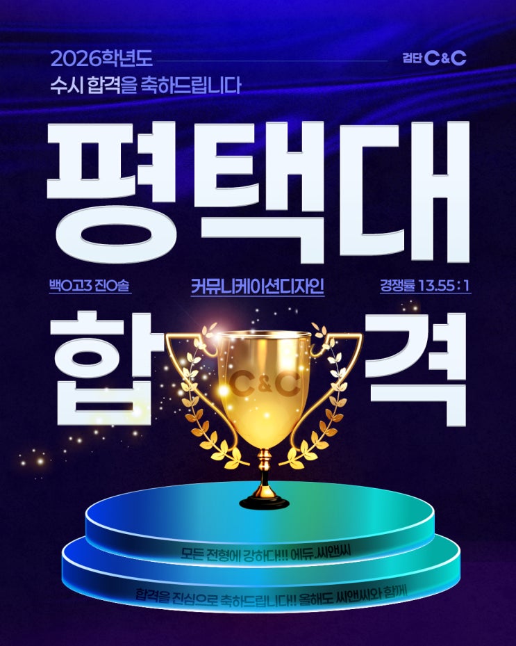 안녕하세요~ 인천 서구 검단신도시 검단미술학원 검단C&C미술학원입니다! 오늘은 2026학년도 평택대 합격 소식을 전하고자 합니다. 평택대 커뮤니케이션디자인 경쟁률 13.55:1 수시 합격을 축하합니다!! 2026학년도 평택대 합격생 재현작입니다. 검단C&C 미술학원은 오늘도 달립니다 ! 미대입시는 C&C , 합격은 C&C 2025 제1차 전국 연합 C&C 연구작 품평회 최우수상 서울, 경기권 최다 수상! 검증된 선생님들의 실력✍️ ✔ 중등부터 고등까지 이동 없이 한곳에서! ✔ 각 반 담임제 · 학년별 체계적인 수업 검단 씨앤씨미술학원에서는 예비 미술인들의 관심, 대환영 합니다:) 문의사항 032-563-1586 마전역 2번 출....... <img src="https://blogthumb.pstatic.net/MjAyNjAyMjhfMjg4/MDAxNzcyMjU1MjE4Nzc1.6V6ZnSobMRnyWuIGLnb9OdJHHJ3vnVduaH0ttN5cJAYg.8SrBcm0EyP6vcemUmuKy3sjVIbIEyzksxTFsH3M_F5Ag.JPEG/KakaoTalk_20260107_200607612_03.jpg?type=s3" />