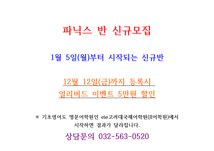 날씨가 제법 추워지고 있는 11월 입니다. 요즘 독감이 유행하고 있어 건강에 유의해야되는 시기인데요. 이 추위를 한번에 날려버릴 따끈따끈한 이벤트를 소개 해드리려고 합니다. 바로 11월 27일 목요일과 11월 29일 토요일에 총 2회에 걸쳐 설명회가 열립니다!!! 내년에 초등학교 입학하는 예비 초1 학생들 부터 고등학생까지 모든 학부모님들이 대상이며 현재 자리가 얼마 안남았습니다ㅠ 앞으로 다가오는 무시무시하고 예측불가능한 시대, 우리 아이의 교육방향은 어때야 할까요? 전반적인 교육의 틀과 방향을 잡아드릴 수 있는 시간이 되면 좋겠습니다. 전체적인 설명회는 원장인 제가 진행하고 Q&A 시간에는 해외 대학 컨설팅의 정수 부....... <img src="https://blogthumb.pstatic.net/MjAyNTExMTFfMTU5/MDAxNzYyODI0NTcxOTA3.XyZN5YLGPV0TF4jsVpIJjdAyFpuELKkEYJuM5HzOj6kg.6ivF7zjenfrcqttvyXWoMEQ4sPGJk7fDunx7o2pAC5Mg.JPEG/%BC%BE%C5%AC_%BC%B3%B8%ED%C8%B8_2025.jpg?type=s3" />