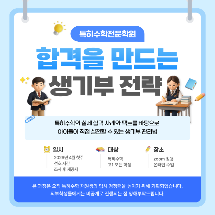 요즘 입시는 단순히 내신 성적만으로 결정되지 않습니다. 학생부(생기부)는 이제 ‘보조 자료’가 아니라, 합격을 좌우하는 핵심 요소입니다. 하지만 많은 학생들이 무엇을, 어떻게 기록해야 하는지 몰라 막연하게 채우거나 중요한 기회를 놓치고 있습니다. 특히수학에서는 떠도는 정보가 아닌 실제 합격 사례를 바탕으로 학생들이 바로 적용할 수 있는 생기부 관리 방법을 안내합니다. 단순한 이론이 아니라, 학생 스스로 방향을 잡을 수 있도록 돕는 실전 중심 수업입니다. 교육 일정 4월 첫째 주말 (Zoom 진행 / 1회차, 필요시 보충) 대상 특히수학 재원생 상담문의 032-566-2094 네이버 톡톡 문의 상시 답변중 <img src="https://blogthumb.pstatic.net/MjAyNjAzMTdfMTc2/MDAxNzczNzM5Mjk5NTYy.Cgx1fQLUcPeo6ZHWNkQVFgf2vzJKMI8EmVv46dMwbywg.XUowmAl5i4uH9RjNheiFfLbd9Oqozjl5vuc___ogdWEg.PNG/%C1%A6%B8%F1%C0%BB_%C0%D4%B7%C2%C7%D8%C1%D6%BC%BC%BF%E4._%2837%29.png?type=s3" />