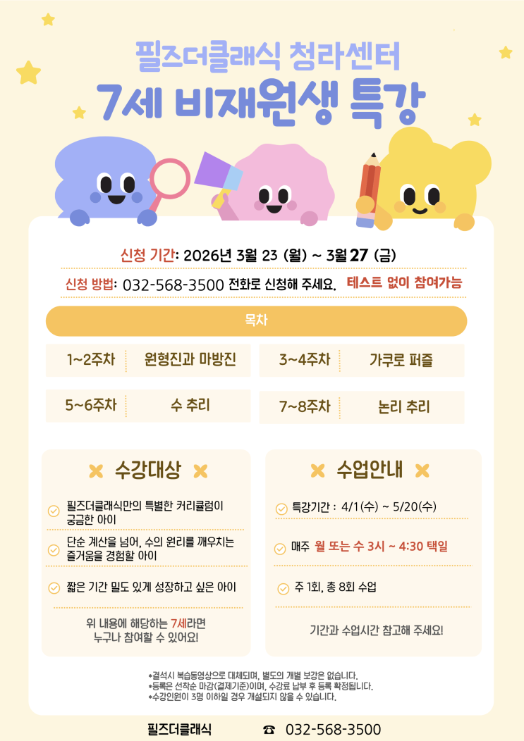 #청라수학학원 #청라경시학원 #청라심화수학 #청라필즈더클래식 테스트 없이 듣는 비재원생 특강 [필즈더클래식] 테스트 없이 만나는 필즈의 특별한 수업 필즈의 우수한 콘텐츠를 경험하고 싶어도 입학 테스트 부담 때문에 주저하셨던 학부모님들을 위해 무시험 비재원생 특강을 개설합니다. 교재 만족도 1위, 아이들이 먼저 즐거워하는 필즈의 수업! 이번 특강을 통해 우리 아이의 숨겨진 잠재력을 확인해 보시기 바랍니다. 상담문의 : 032 - 568 - 3500 <img src="https://blogthumb.pstatic.net/MjAyNjAzMjBfNzEg/MDAxNzc0MDA2NzcwMDM1.WZ9eUV2B5cJQr6GeiEYmL-xtip_DrBrxtRxNbouKgR0g.3UVITXz1pt5ixhQ30VGqbLqq1Mcz-qS-7Mtg5Zoe94Ug.PNG/%BD%BA%C5%A9%B8%B0%BC%A6_2026-03-20_%BF%C0%C8%C4_8.37.21.png?type=s3" />