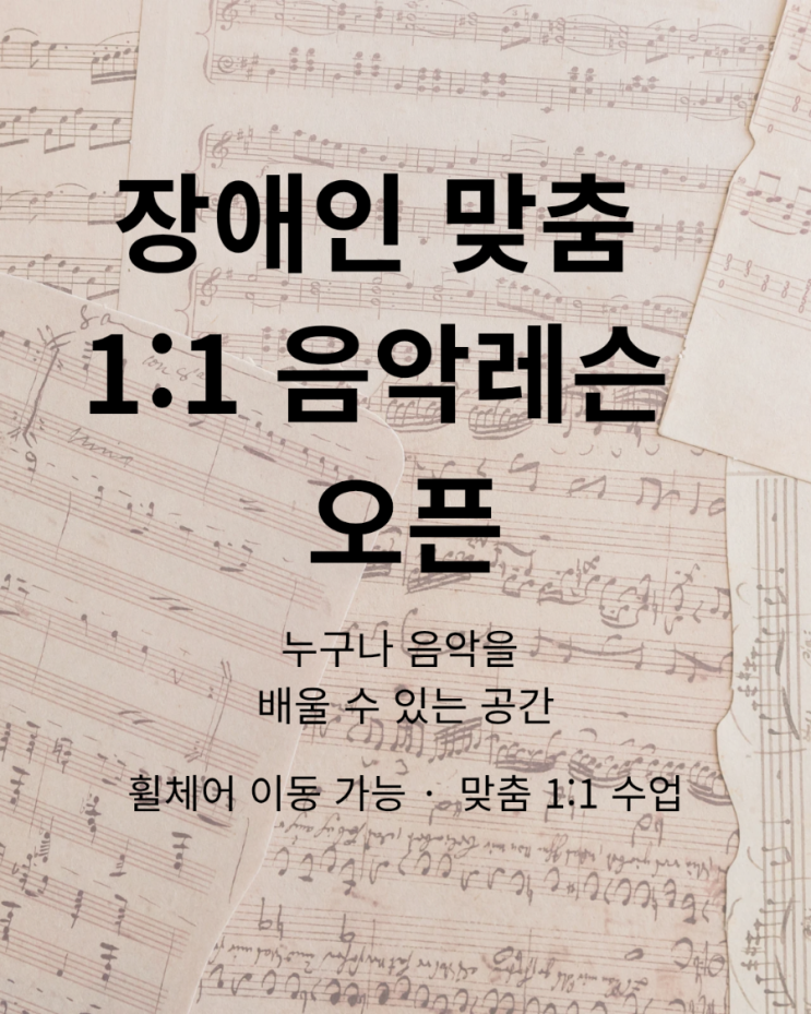 장애인 맞춤 1:1 음악 레슨 오픈 누구나 음악을 배울 수 있는 공간 휠체어 이동이 편한 구조의 음악 스튜디오에서 편안하게 음악을 배울 수 있는 수업을 시작합니다 :) 피아노 / 우쿨렐레 / 오카리나 각자의 속도에 맞춰 천천히 진행합니다 ✔️ 장애인활동지원사 자격 보유 ✔️ 1:1 맞춤 레슨 ✔️ 보호자 동반 가능 ✔️ 턱 없는 구조 / 엘레베이터 이용 가능 레슨 안내 40분 / 주 1회 / 월 4회 정가 12만원 오픈 이벤트 첫 달 10만원 체험 1회 2만원 음악으로 작은 즐거움을 함께 만들어요 편하게 문의 주세요 카카오톡 오픈채팅 https://open.kakao.com/o/sX1VRDki <img src="https://blogthumb.pstatic.net/MjAyNjAzMjFfMTE1/MDAxNzc0MDY4MTAwNjQ0.jse3gO-1QObnyy0TPqiX4sK9MKfmwDjK0KlGH7aRDzIg.oUW4a9DwT1T8tyVd08JlDGHSgpT1YCX-dK_ZMa7MOz0g.PNG/900%A3%DF%BE%C6%B6%F3%B9%C2%A3%DF20260321%A3%DF115300%A3%DF0000.png?type=s3" />