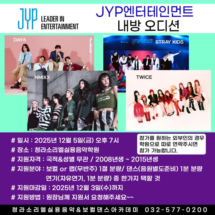 안녕하세요~ 인천 청라 보컬댄스전문학원 청라소리엘실용음악&보컬댄스아카데미 입니다. 12월의 기획사 내방 오디션 안내드립니다. 12월 5일 금요일 오후 7시에 JYP엔터테인먼트 내방오디션이 본원에서 진행됩니다. 본 오디션은 재원생 외의 외부인도 지원이 가능합니다. 외부인 중 지원을 원하시는 분은 학원으로 연락주시면 지원서를 보내드리도록 하겠습니다. 청라소리엘은 매달 기획사 내방오디션을 통해 아이돌을 꿈꾸는 친구들이 원하는 목표를 이룰 수 있는 기회를 제공하고 있으며 오디션에서 좋은 결과를 만들 수 있도록 최선을 다해 교육하고 있습니다. 오디션 준비에 관해 궁금한 점이 있으시다면 언제든 학원으로 연락주세요! 친....... <img src="https://blogthumb.pstatic.net/MjAyNTExMjVfMTcz/MDAxNzY0MDY2NjUzMjk1.w_TvcBOkNDMULnsRGZ8FUYX_FlcUA0p5s2RnanE_9X8g.MC4U0lDu0jnT5QGy2dCknuwiVe5THSeoiI2Z0OIkNnkg.JPEG/25%B3%E2New%BF%C0%B5%F0%BC%C7%C6%F7%BD%BA%C5%CD.jpg?type=s3" />