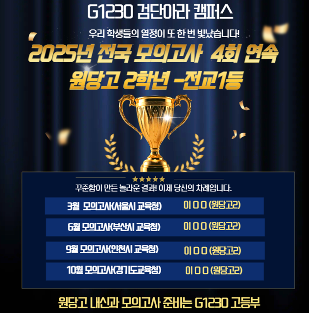 G1230 검단 아라 캠퍼스 고등부! 고1,2 학생들에게는 중요한 시험들이 있습니다. 그 중에서도 교육청 모의고사는 3월 28일, 6월 4일, 9월 4일, 10월 15일에 치러집니다. 2025년 1년간 4번의 시험- 전국적으로 치뤄지는 시험으로 학생들의 성적을 객관적으로 알아 볼 수 있는 중요한 시험입니다. G1230고등부에 재학중인 원당고 2학년 이 O O학생이 모의고사 전교 1등을 4번 연속 이루었습니다. 노력과 열정이 만든 최고의 결과 입니다. 체계적인 관리와 검증된 커리큘럼, 전교 1등이 증명합니다. 실력으로 증명하는 학원, 전교 1등이 선택한 곳. G1230 검단 아라 캠퍼스 고등부입니다. <img src="https://blogthumb.pstatic.net/MjAyNTExMjdfMjg5/MDAxNzY0MjQ0NjQ4NDM4._3uXwJVJbXuD3QUm10dduyzAqYEV3kM8nnk6KYaiHGkg.97Rmw2Z12AWQRtWz7gEuvDW5TOR7pOwStrIeYRtPN1Ug.PNG/image.png?type=s3" />