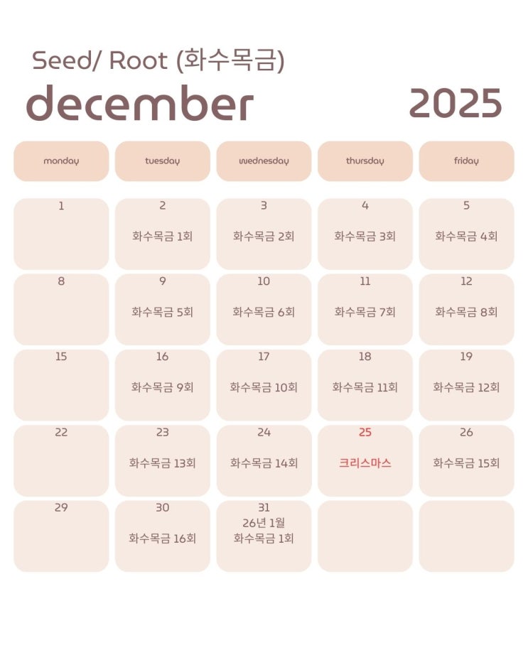 안녕하세요 차차영어학원입니다. 저희 차차영어학원에서는 영어 원서로 수업을 하고, 아이들의 독해 능력 뿐만 아니라, 읽기 부분에서 어떤 내용인지 파악할 수 있게끔 아이들의 문해력 또한 성장할 수 있도록 체계적으로 수업하고 있습니다. 다음은 12월 수업 스케줄입니다 참고 부탁드립니다 :) 1. 주 4회, 화수목금 반입니다. (Seed, Root) 12월 2일 ~ 12월 30일 (총 16회차 수업)입니다. 2. 주 2회, 화목 입니다. 11월 27일 ~ 12월 23일 (총 8회차 수업)입니다. 3. 주 3회, 월화목 반입니다. 11월 27일 ~ 12월 23일 (총 12회차 수업)입니다. 4. 주 3회, 월수금 입니다. 12월 3일 ~ 12월 29일 (총 12회차 수업)입니다. 5. 주 3회, 월수금 입니....... <img src="https://blogthumb.pstatic.net/MjAyNTA5MTJfMyAg/MDAxNzU3NjY2OTgzODA5.B40HtkAGuNxX2gV342mBZHscSYscQ8b7TNEI0HXBhMEg.c-CdtGB_PlXeO7wGxqNrtzMUZi1GBtA_uZz_ubGrdSUg.JPEG/54.jpg?type=s3" />