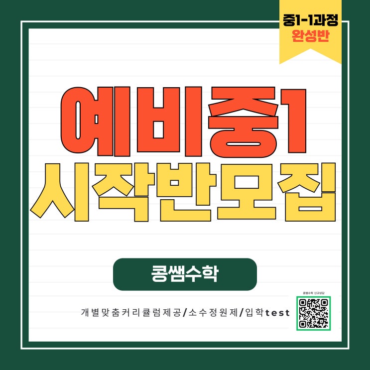 예비중1 시작반 모집! 중1-1과정 완성, 콩쌤수학에서 확실하게 준비하세요 안녕하세요, 콩쌤수학입니다 이제 곧 초등을 마무리하고 중학교 생활을 준비하는 중요한 시기죠. 특히 중1 1학기 수학은 앞으로의 수학 성적을 결정짓는 매우 중요한 출발점입니다. 초등 내용에서 조금만 헷갈려도, 중학교에 올라가면 연산·개념·서술형 모두 어려움이 생기기 때문에 예비중1 단계에서의 선행이 무엇보다 중요합니다. 콩쌤수학 예비중1 시작반은 이렇게 진행됩니다! ✔ 중1 1학기 전 범위 완성 소인수분해 ~ 일차방정식까지 체계적으로 학습 개념 → 유형 → 응용까지 단계별 훈련 제공 ✔ 개별 맞춤 커리큘럼 제공 아이마다 부족한 영역이 다....... <img src="https://blogthumb.pstatic.net/MjAyNTExMjdfNDgg/MDAxNzY0MjE3OTk3OTg5.aez67GVeoUxcRnjpuFMlKA87TbjsLeGY7rOoOInS9ssg.ntkq-N1mp_t8kuZcCFpjcrIccN6Nb6HOy4U4VDffV7Ag.JPEG/%C1%DF1.jpg?type=s3" />