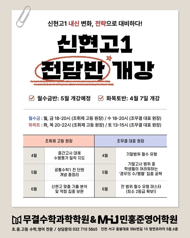 안녕하세요 대학을 바꾸는 청라수학학원, 무결수학학원입니다. 이번년도 신현고 1학년 수학 시험은 중간고사를 수행평가로 대체하고, 기말고사만 진행하는 것으로 확정되었습니다. 단 한 번의 기말고사로 성적이 결정되는 만큼, 준비 방식이 결과를 결정합니다. 넓어진 시험 범위와 늘어난 학습량, 어떻게 준비해야될지 고민되셨죠? 그 방향을 잡아드리기 위해, 무결수학은 신현고 전담반을 개설합니다! 무결수학 신현고 전담반, 어떻게 진행될까요? 원장진 직강 시스템! 신현고등학교 1학년 전담반은 무결수학학원 조무결 대표원장님과 조휘제 고등부 원장님이 직접 수업을 진행합니다. 다년간 청라 지역 고등 내신을 지도해 온 경험을 바....... <img src="https://blogthumb.pstatic.net/MjAyNjA0MDJfMTU2/MDAxNzc1MTI0NTgyNTIw.p2_0HjW0mqasbW5pZLD0Yr0awSyqfj37YyZtC6a_rT0g.rpqtO-ATj1RxFUr3am5eyTSv07C9AvTQ93r1vMTciwAg.JPEG/%BD%C5%C7%F6%B0%ED%C6%F7%BD%BA%C5%CD%C1%A6%C0%DB%C1%DF-001.jpg?type=s3" />