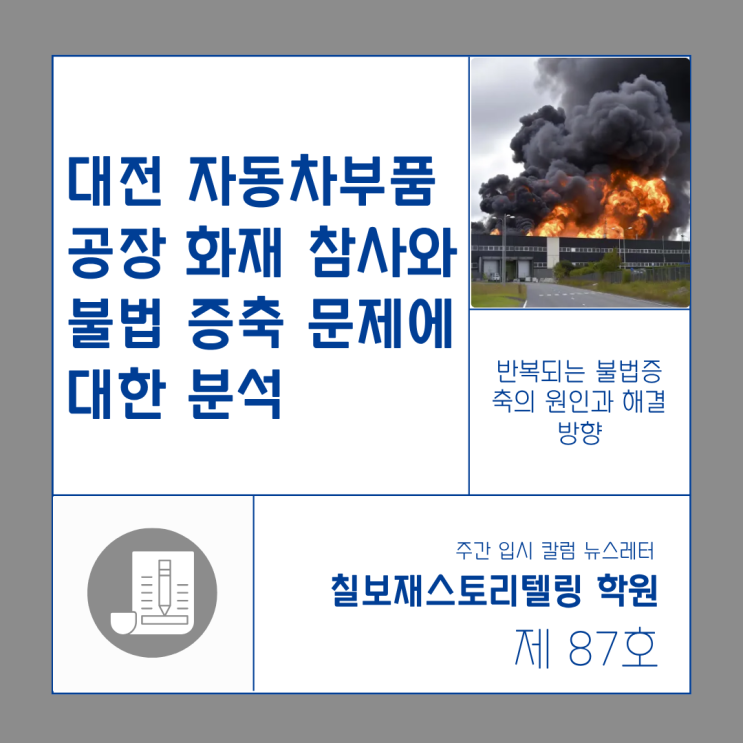 [칠보재 세특보감 87호] 대전 자동차부품 공장 화재 참사와 불법 증축 문제에 대한 분석ㅣ불법 증축 대전 공장 화재 입시 칼럼 칠보재 스토리텔링학원