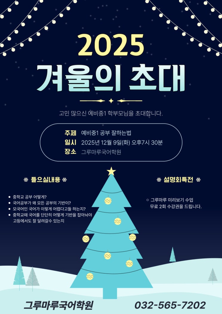 안녕하세요! 날이 추워졌네요 +.+ 12월이니까 확실히 11월하고는 공기의 온도가 다르긴합니다- 추워야 겨울이긴하죠!! 오늘은 예비중1 현재 초6 학부모님들을 위한 따뜻한 소식을 전하려고 펜을잡,, 키보드에 손에 올려봅니다^^ 예비중1 학부모님들 아기아기 하던 아이가 어느새 초등학교를 무사히 잘 마치고, 중학생이 됩니다. 언제 이렇게 컸나 하시면서 뿌듯하면서도, 이제 조금씩 독립하려는 아이를 모며 조금은 아쉬운 마음도 드실꺼라 생각듭니다. 또한 감성적인것과 별개로 , 실제로 6년이라는 긴 레이스를 위한 출반선에 우리아이에게 우리가 어떻게 도와주어야 할지 막막하시거나 고민이 많이 되시리라 생각됩니다. 우리 아이는 이제 더....... <img src="https://blogthumb.pstatic.net/MjAyNTEyMDJfMjk1/MDAxNzY0NjU5MzM0NzAw.VHPHusGfex3ekuXiOFwa9CORwX6y1MJlHoiuF6HPAtkg.Yzc5CR4eJt9mQ2OYdZ4qAKgoULrFT7PJ9E5E39zOfXIg.JPEG/%C1%A6%B8%F1%C0%BB-%C0%D4%B7%C2%C7%D8%C1%D6%BC%BC%BF%E4_-001_%282%29.jpg?type=s3" />