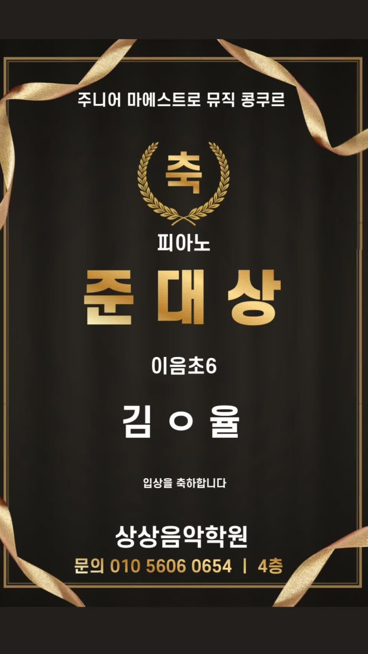 안녕하세요, 상상음악학원입니다. 피아노 레슨을 진행하면서 아이들의 잠재력을 ‘무대 경험’으로 연결해주는 지도에 큰 비중을 두고 있습니다. 이번에는 초6 ㅇㅇ 학생이 첫 콩쿨에서 준대상을 수상해 그 과정을 전문적인 관점에서 정리해보려고 해요. 1. 콩쿨 경험이 없던 고학년 학생의 ‘진단 레슨’ ㅇㅇ 학생은 6학년까지 꾸준히 피아노를 배워왔지만 콩쿨 경험은 전혀 없었던 상황이었습니다. 원당동 학원으로 인수 후 첫 상담에서 연주 스타일, 손 모양, 터치 감각, 해석 능력을 차근히 체크했고 “무대 경험을 통해 성장할 수 있는 학생”이라고 판단했습니다. 이 부분은 학부모님들께서 가장 궁금해하시는 **‘우리 아이도 콩쿨....... <img src="https://phinf.pstatic.net/image.nmv/blog_2025_12_04_4064/53N91Dpurj_01.jpg?type=f480x480" />