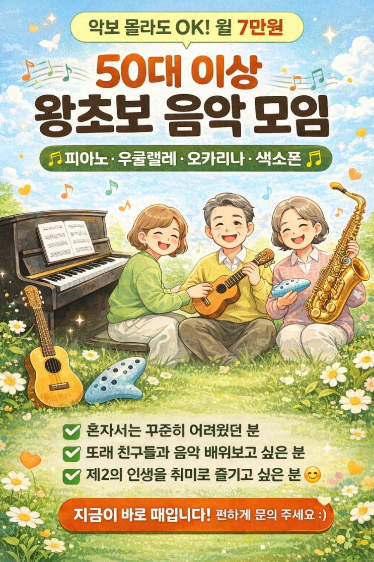 50대 이상 왕초보 음악모임 (피아노·우쿨렐레·오카리나·색소폰) “지금 시작해도 늦지 않았어요” ✔ 악보 몰라도 OK ✔ 손이 굳어도 OK ✔ 완전 처음도 환영 혼자 배우다 포기하셨던 분들 취미 하나 제대로 만들어보고 싶은 분들 제2의 인생, 음악으로 시작하고 싶은 분들 수업 방식 소그룹 3~4명 (편안하게 진행) 1회 50분 수업 레슨 → 개인연습 → 피드백 완전 기초부터 천천히 가능 악기 피아노 / 우쿨렐레 / 오카리나 / 색소폰 수업 시간 오전 10:00 / 11:00 (요일 협의) 수강료 월 4회 / 7만원 이런 분께 추천드려요 ✔ 혼자 하면 꾸준히 못하셨던 분 ✔ 또래끼리 편하게 배우고 싶은....... <img src="https://blogthumb.pstatic.net/MjAyNjAzMThfMjY0/MDAxNzczNzk3ODM2MzE2.FzoK5VTTnWoOmGksLU8lI4KeFAxFar9JytEdHJsFEMQg.V9g7jw4-EVN5-vjogwlRiwAaJPgpxT6GC3O1uF9FvE0g.PNG/900%A3%DFfile%A3%DF00000000dcf87206a9dd90a886464833.png?type=s3" />