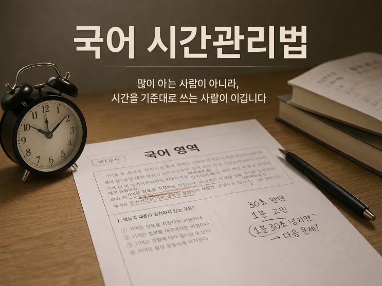 국어 시험이 끝난 뒤 학생들이 가장 많이 하는 말이 있습니다. “시간이 부족해서 뒤를 못 풀었어요.” 하지만 시험지를 같이 보면 단순히 시간이 부족한 경우는 많지 않습니다. 대부분은 어디에서 시간을 쓰고 있는지 모르는 상태입니다. 아래 지문 하나로 실제 시험 상황을 같이 보겠습니다. [지문] 사람들은 흔히 기억을 정보를 저장하는 과정이라고 생각한다. 그러나 현대 심리학에서는 기억을 정보를 재구성하는 과정으로 본다. 즉, 기억은 과거의 경험을 그대로 떠올리는 것이 아니라 현재의 상황과 기존 경험이 결합되어 새롭게 구성되는 것이다. [문제] 다음 중 글의 내용과 일치하지 않는 것은? ① 기억은 정보를 저장하는 과정이다 ②....... <img src="https://blogthumb.pstatic.net/MjAyNjAzMjJfMjQ4/MDAxNzc0MTU2NzU5NTU3.FxDln3RRHuRnMzTBivsOmlznHDxDdH1tU6H33GDMYQsg.LlmT7N6C9MX6gy-7A-mRdOrLcb7uRfAwlmQqPwvgpCUg.JPEG/%BD%C3%B0%A3%B0%FC%B8%AE%B9%FD.jpg?type=s3" />