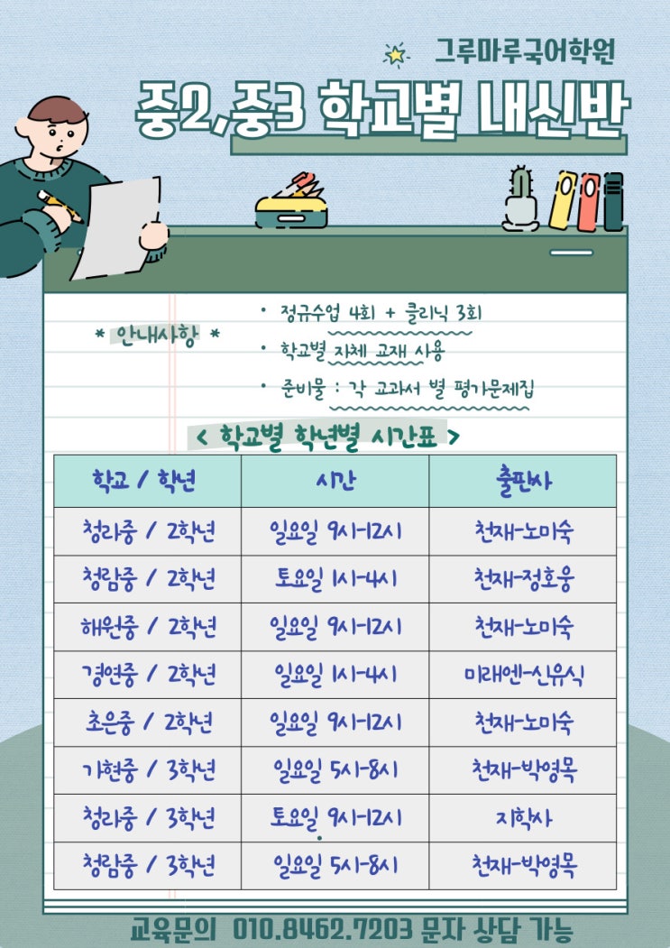 안녕하세요! 그루마루입니다- 미세먼지 때문에 날씨가 화창하진 않지만ㅠ 그래도 16-7도로 따스한 봄날이네요 :) 아마 다음주 쯤이면 벚꽃도 슬슬 피어오를 것 같습니다- 벚꽃이 필때쯤이면- 우리 아이 새로운 학년의 첫 관문 중간고사가 시즌이 되죠^^ 동아리다 뭐다 바빴던 3월을 마무리 하고 이제는 학업에 집중할 때입니다. 새로운 학년의 새문을 활짝 열수 있게끔 올해도 그루마루 함께합니다- 우리 학부모님들께서 수업을 함께 하실수 없으니, 자세히 스텝별로 한번 안내드리려고 합니다 ^^ [주말수업] 첫번째 _ 지난주 복습평가 (서술형) 두번째 _ 여러아이들의 필기를 바탕으로 한 학교별 자체교재로 수업진행, 모의고사 및 기출 풀이 세....... <img src="https://blogthumb.pstatic.net/MjAyNjAzMjlfNTkg/MDAxNzc0NzY2NjA1ODky.n7r2DMDBb_KBDaQ1t7pV5zK0lPdpOa7P6gwiRbER1Ecg.ifted4n_KHZc2LXk9WpjvopzaalaSw5ik7SEJSZf1kog.JPEG/26%C1%DF%B5%EE%C1%DF%B0%A3%B0%ED%BB%E7_%C0%A5%BF%EB.jpg?type=s3" />