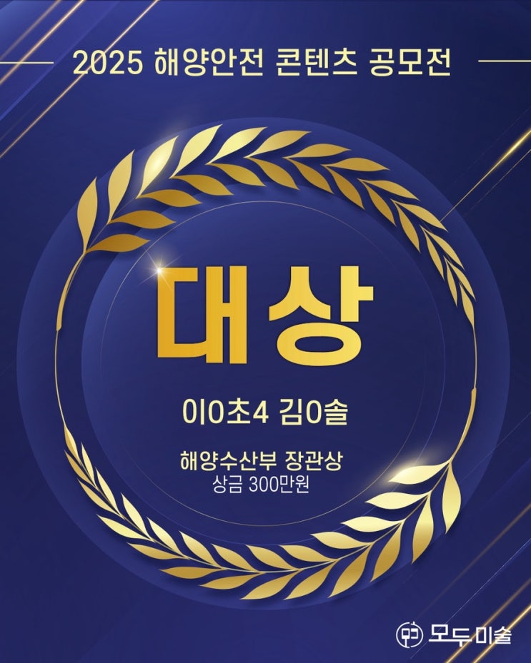 안녕하세요, 모두미술입니다. 오늘 정말 가슴 벅찬 소식을 전해드리게 되어 영광입니다. 모두미술이 이번 해양안전 콘텐츠 공모전에서 대상인 해양수산부 장관상을 수상하는 쾌거를 이루었습니다. 전국에서 수많은 수준 높은 작품이 출품된 가운데, 모두미술만의 창의적인 시선과 탄탄한 실력이 가장 빛난 순간이었습니다. 이번 대상 수상으로 300만원이라는 상금과 함께 해양부 장관상이라는 명예까지 얻게 되어 감회가 새롭습니다. 수상내역 대상 - 해양수산부 장관상 (상금 300만원) ✔️이번 대상 수상이 더욱 뜻깊은 이유 전국 규모의 공모전 : 특정 지역이 아닌 전국을 대상으로 한 공모전에서 최고의 상을 받았습니다. 명예로운 장....... <img src="https://blogthumb.pstatic.net/MjAyNjAzMzBfMjEx/MDAxNzc0ODQ5ODgyMTAz.f7tRDB7GyhQ3em8Ptdt8CNofPF89iZ6AOqEPmWgMGJUg.j3csZ4fNO3s9c07O5pCt-6JsBEaPW6798vtsuTRuVQwg.JPEG/IMG%A3%DF2694.JPG?type=s3" />