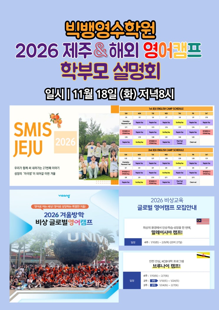 추운 날씨에도 영어캠프 설명회에 참석해 주신 학부모님 감사합니다!! 변화하는 영어 방향에 많은 도움이 되셨을거라 생각합니다^^ 영어는 수학과 달리 새로운 변화에 대한 적용이 필요하죠~ 영어 캠프가 처음인 친구들은 해외캠프 보다는 국내 캠프를 먼저 체험해 보는 것이 더 효율적이예요^^ 영어캠프를 보낼때는 체크해야할 것들이 많아요~ ▥ 꼭 확인해야 할 사항들 ▥ ▶ 캠프 주최 기관은 믿을만 한가 ▶ 원어민 교사 채용방법이 까다로운가 ▶ 인솔자의 경력과 자격증을 갖추고 있는가 ▶ 응급상황에 대한 대처 프로세스가 마련되어 있는가 ▶ 전체 프로그램과 세부프로그램이 우리 아이와 맞는가 ▶ 자기주도 활동이 너무 많이 적용되어....... <img src="https://blogthumb.pstatic.net/MjAyNTExMjBfNDUg/MDAxNzYzNjE5ODc0Nzkw.qxJCQr8hhXEcTN5P0CIxikOV8IwTCQa59hNSF-RRBY4g.0QIViN2-Ci9VP5Z1MwNH4hsJ__LYFTJbmublGoIBN8Ig.JPEG/%C1%A6%B8%F1%C0%BB-%C0%D4%B7%C2%C7%D8%C1%D6%BC%BC%BF%E4_-001_%284%29.jpg?type=s3" />