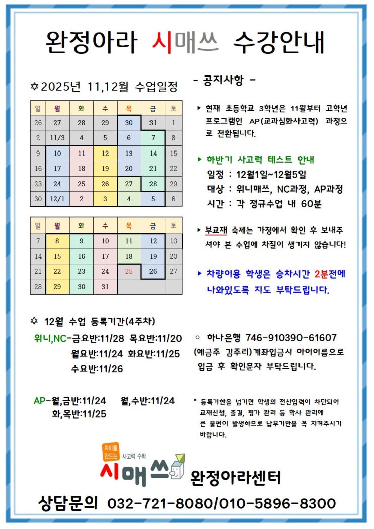 안녕하세요 청라 5단지 수학전문학원 청라현수학학원입니다. 올 한해 첫 새해인사를 드린게 어제 같은데 벌써 한 해의 끝인 12월을 달리고 있습니다. 추워진 날씨에 청라 맹모님들 감기 조심하시고, 얼마 남지 않은 2025년도 한 해 잘 마무리 되시길 바랍니다. 청라현수학학원에서도 2025 마지막 시험을 위해 최선을 다하고 있는 요즘입니다. 그리고 이 시기가 되면 늘 그랬듯이 내년 중학교 입학을 앞두고 첫 내신시험을 치르게 될 아이들을 걱정하는 학부모님들의 상담,문의전화로 바쁜 하루하루를 보내고 있습니다. 중등 과정이 시작되면서 아이들이 어려워하는 개념들과 쉽지 않아지고 있는 학교별 시험들로 걱정이 많으심을 충분히 알고 있....... <img src="https://blogthumb.pstatic.net/MjAyNTEyMDlfMTU3/MDAxNzY1MjY1MjA1Njgx.Qrt8Z_dh5IWxIwYcUuUPxHR5ECzJo12s4AfaY9eIH0Ug.IWdgCfACayzCQZT53ZAM9oaFWlIP2lC8Tw3cdSznmY4g.JPEG/%BF%B9%BA%F1%C1%DF1_%BD%C5%B1%D4%B9%DD.jpg?type=s3" />