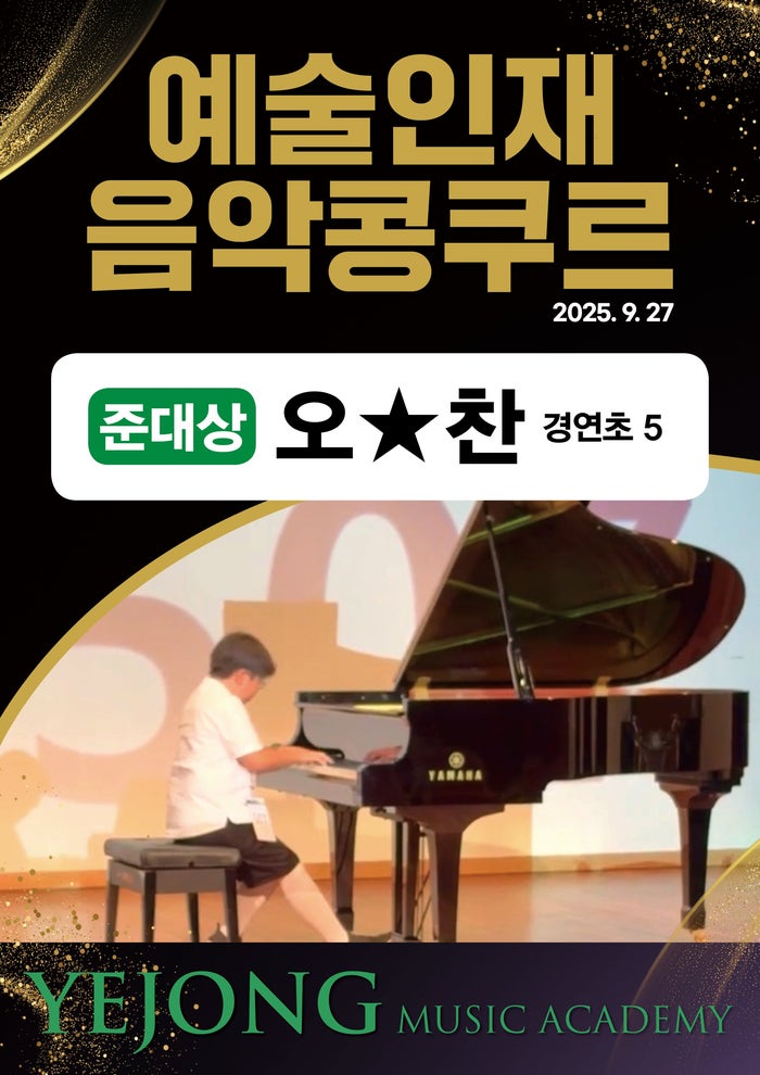아름다운 음악과 즐거움이 함께 하는 청라 경연예종음악학원 청라경연초 피아노 경연예종음악학원입니다. 9월 27일 토요일 고양시 토당청소년수련관 대강당에서 개최된 예술인재음악콩쿠르에서 경연초등학교 5학년에 재학중인 오★찬 학생이 준대상을 수상했어요. 오★찬 학생은 남자이지만, 음악을 아주 좋아하는 친구예요. 콩쿠르에 여러 번 참가하여 수상을 했었고, 지난해 개최했던 경연예종음악학원 페스티벌(연주회)에도 참가해 갈고 닦은 실력을 뽐내기도 했었답니다. 오★찬 학생은 지난 7월 25일에 개최된 조은음악신문 전국학생음악콩쿠르에서 차상을 수상하기도 했어요. 지난 2024년 경연예종음악학원 페스티벌(연주회)에서 연주했던....... <img src="https://blogthumb.pstatic.net/MjAyNTExMjdfMjU2/MDAxNzY0MjI5MzA5NzAz.0YD6DVOsscGl6xIkQC9eKKhoffMCpeCpGKcX4eGv2DQg.Vas0zxipfgy9bq_FuCL1stBHpwncuByNDysFKC7X2k4g.JPEG/250927_%BF%B9%BC%FA%C0%CE%C0%E7%C0%BD%BE%C7%C4%E1%C4%ED%B8%A3_%C6%F7%BD%BA%C5%CD_%BA%ED%B7%CE%B1%D7.jpg?type=s3" />