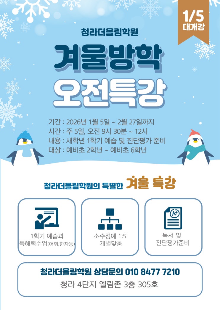 안녕하세요~ 청라더올림 안원장입니다^^ 2025년 한 해 어떠셨나요?? 계획한 모든 일들을 이루고 건강하고 행복한 한 해를 보내셨는지요~ 3월 개학과 동시에 1학기 순삭!!! 여름방학은 너무 짧아서 기억도 잘 안나고~~ 뜨거운 가을을 보내고 나니~~ 달력이 한 장 남았네요.. 남은 한 달, 30일! 짧다면 짧지만 미뤄두었던 일들을 잘 마무리 할 수 있는 충분한 시간이기도 한 것 같습니다. 모두모두 화이팅하셔서 남은 한 달 알차게 보내주시 바랍니다. 올해도 어김없이 방학동안 오전특강 수업을 준비했습니다. 따란~~~~~~~ 여름방학보다 기간은 2배이지만 챙겨야 할 것들도 2배입니다. 이번 겨울방학동안 무엇을 하냐구요?? 1. 1학기 수학예습 - 다....... <img src="https://blogthumb.pstatic.net/MjAyNTExMzBfOCAg/MDAxNzY0NDgxODgwNDYx.6muO0M-v7QJwOPqUjkuSSxqA-0-jZo6ZP2yinZQvfPQg.aCo1KrDgORmzFxtsyKmvEacCOYKU9KCiAMgZrgRgL5Ag.JPEG/2026%B3%E2_%B0%DC%BF%EF%B9%E6%C7%D0.jpg?type=s3" />