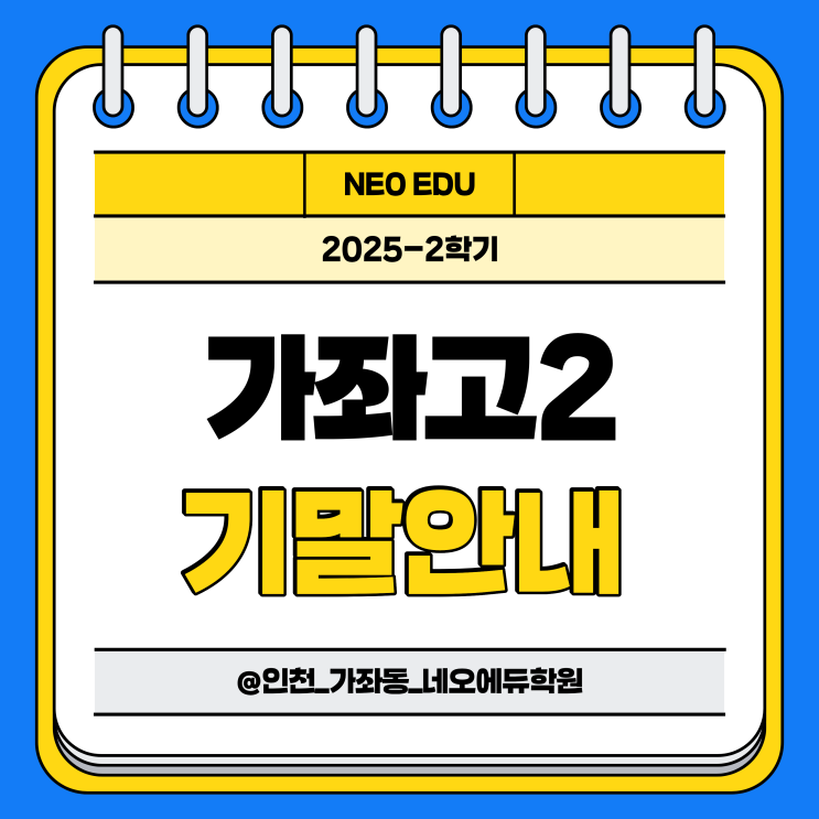 안녕하세요. 인천 가좌동 네오에듀학원입니다 ^^ 가좌고 2학년 2학기 기말고사 일정을 정리해 안내드립니다. 학습 계획 세우는 데 꼭 참고하세요. 가좌고등학교 2학년 ✔️ 12월 16일 (화) ㆍ[1교시 - 정법,물리] [정치와 법] 교과서 p.150~끝 / [물리학Ⅰ] Ⅲ. 파동과 정보통신 (교과서 p.145~189) ㆍ[2교시 - 일어,중어] [일본어Ⅰ] 0 ~ 7단원 / [중국어Ⅰ] 중국개관, 중국어개관, 중국어의 발음, 학습지 (1 ~ 6단원) ㆍ[3교시 - 기하] Ⅱ. 평면벡터 ~ Ⅲ. 공간도형과 공간좌표 ✔️ 12월 17일 (수) ㆍ[1교시 - 윤사] [윤리와 사상] 사회사상 : 이상사회는 실현가능한가? ~ 평화 : 세계 시민과 세계 평화는 실현 가능한가? (p.166~221) ㆍ....... <img src="https://blogthumb.pstatic.net/MjAyNTEyMDlfNDgg/MDAxNzY1MjQ3ODcxMDY3.XSp6bjC9ySkXCTpKHC-YYlrHZCTaz-75IVYOLIIJ2_Eg.blKZmshgFAFvyIbhxlk1tZFSTS23yHP0ETo9IYlNptwg.PNG/%C1%A6%B8%F1%C0%BB_%C0%D4%B7%C2%C7%D8%C1%D6%BC%BC%BF%E4.png?type=s3" />