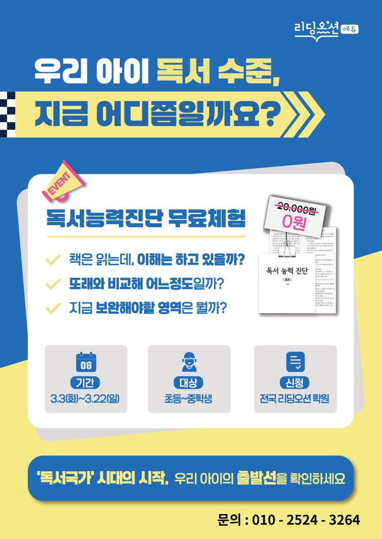 안녕하세요, 요즘 학습의 기본이 되는 가장 중요한 능력은,,,, 바로 독서능력이라는 사실 알고 계시나요? 책을 많이 읽는 것과 문해력이 좋은 것은 다릅니다. 아이의 현재 독서 수준을 정확히 알고 맞춤 학습을 시작하는 것이 무엇보다 중요합니다. 그래서 준비했습니다!! 리딩오션 독서능력 무료진단평가란? 리딩오션에서 진행하는 이번 무료진단평가는 아이의 독서 능력을 체계적으로 분석하여 ✔ 어휘 이해력 ✔ 글의 내용 파악 능력 ✔ 추론 및 사고력 ✔ 학년 대비 독해 수준 을 종합적으로 확인할 수 있는 전문 평가입니다. 단순 테스트가 아닌, 아이의 현재 독서 위치를 정확히 진단해드립니다. 이런 학부모님께 추천드려요 아이가 책 읽....... <img src="https://blogthumb.pstatic.net/MjAyNjAzMDFfODIg/MDAxNzcyMzQ1NTQ3Mjc3.sFtyNpYq_Btq4VOvsMJE2p1tR-KyiriVHnSKjacbLWQg.SENqtZ2wUwR5rLt_-IQS-517UuqArz1amJOvw_qzxVAg.JPEG/%B2%D9%B9%CC%B1%E2Beige_and_Black_Minimalist_Size_Chart_Instagram_Post.jpg?type=s3" />