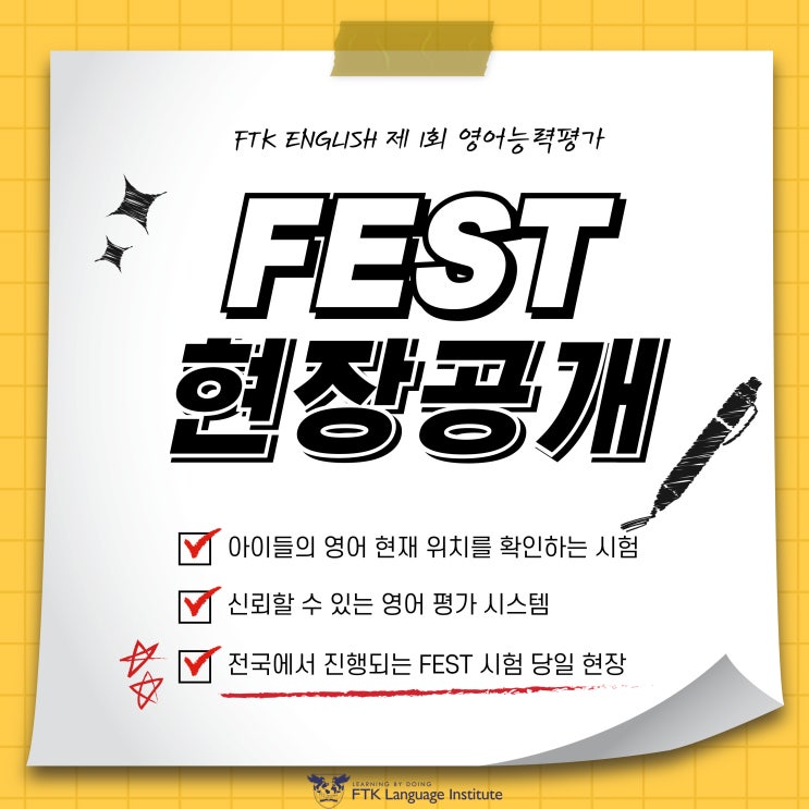 안녕하세요 FTK English입니다. 오늘 드디어 FTK의 제 1회 영어능력평가 FEST가 치뤄지는 날이었는데요. 이번 포스팅에서는 긴장감 넘쳤던 시험 첫 날 고사장 모습을 여러분들께 공개합니다! 먼저 FEST를 아직 잘 모르시는 분들을 위해! FEST는 어떤 시험인가요? FEST는 점수를 내기 위한 시험이 아닙니다. 아이들이 지금 어떤 수준의 영어를 이해하고 있는지, 현재의 위치를 정확하게 확인하기 위한 진단 시험입니다. 잘 봤는지, 못 봤는지를 나누기보다 아이 한 명, 한 명의 영어가 어떤 방향으로 자라고 있는지를 살펴보는 것이 FEST 시험의 가장 큰 목적입니다. 2️⃣ FEST 시험은 '이것'을 봅니다 FEST는 단순 암기나 속도를 평가....... <img src="https://blogthumb.pstatic.net/MjAyNjAyMTBfOTYg/MDAxNzcwNjg1NDkzNTMx.LEsT7Lw4EjKyC3mQ_aJdRoHeXyOJyiIE2FFVEjPmexsg.gW3MnQ5zqoNofSMMhRrSemZAyxfsrZy2wVnwS8QnfFYg.JPEG/260210_%BA%ED%B7%CE%B1%D7_FTK_-001.jpg?type=s3" />