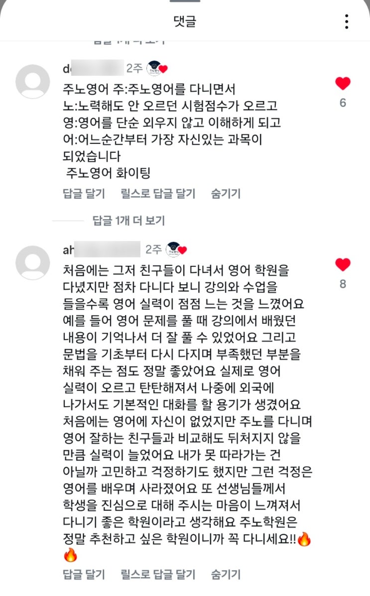 [장안동 영어학원] 주노영어 학생들의 후기