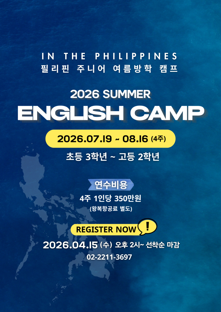 안녕하세요! SDA삼육어학원입니다. 어느덧 차가운 겨울바람이 물러가고, 기분 좋은 봄기운이 찾아오고 있습니다. 새 학기를 맞아 새로운 환경에서 씩씩하게 적응하며 공부에 몰입하고 있을 우리 아이들의 모습이 그려지네요.✨✨ 오늘은 다가올 여름, 아이들에게 선물 같은 시간이 될 '필리핀 여름 캠프' 소식을 기쁜 마음으로 전해드립니다. 지난 캠프 기간 동안 아이들의 행복과 성장을 위해 저희를 믿고 따뜻한 응원을 보내주셨던 학부모님들께 다시 한번 깊은 감사의 인사를 올립니다. 이번 여름에도 그 믿음에 보답하고자 더욱 알찬 프로그램을 준비하려합니다!! [모집 일정 및 방법 안내] - 신청 일시: 4월 15일(수) 오후 2....... <img src="https://blogthumb.pstatic.net/MjAyNjAzMTdfMTI0/MDAxNzczNzMzNjM0MDE2.zky5UaTgBdhSL-PQbWVRhoKtv16U49rO25jW51xWR2Ig.WuHyknDtGC27sgGEQeawYdw1qahfe8xhjXncJQcpQMsg.PNG/image.png?type=s3" />