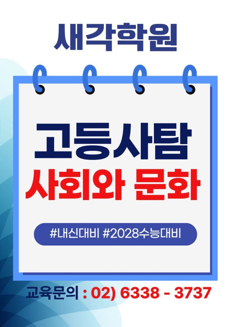 안녕하세요. 새각학원 새각지기입니다. 3월 새학기 고등사탐 개강 안내입니다. 고등 사탐 3월 개강 2028 대입 개편 이후, 사탐은 전략 과목입니다. 1. 사회와 문화 2. 현대 사회와 윤리 과목은 개념을 정확히 이해하면 안정적으로 고득점을 만들 수 있는 과목입니다. 새각학원 사탐 수업은 • 개념 중심 정리 • 학교별 학습지 분석 및 도표·그래프 자료 분석 훈련 • 수능·모의고사 기출 문제 적용 을 통해 내신과 수능을 동시에 대비하는 체계적인 커리큘럼으로 진행됩니다. 사탐은 제대로 준비하면 가장 안정적으로 점수를 만들 수 있는 과목입니다. 개념부터 수능 문제까지 이어지는 체계적인 학습으로 내신과 수능을 동시에 대비합니다. 202....... <img src="https://blogthumb.pstatic.net/MjAyNjAzMDVfMjQ4/MDAxNzcyNzE0NjE0NzE0.G3AA2-JxLZ9fu_QJNMC7Col5wQFazhTiQGyRDnvNsykg.UiCXPPFcMmQNFTbqCeKiFoGrLufVBMKQMnf1uoo04z8g.JPEG/%C1%A6%B8%F1%C0%BB_%C0%D4%B7%C2%C7%D8%C1%D6%BC%BC%BF%E4.-_%BA%B9%BB%E7%BA%BB_%283%29_%283%29.jpg?type=s3" />