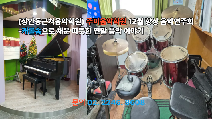 안녕하세요. 장안동 근처 피아노음악학원, 주미음악학원입니다. 12월은 크리스마스가 있는 달인 만큼, 아이들과 함께 캐롤송을 연습하며 한 해를 마무리하는 12월 향상 음악연주회를 진행했습니다. 이번 연주회에서는 아이들이 한 달 동안 준비한 피아노 캐롤 연주, 드럼 캐롤 연주를 중심으로 따뜻하고 밝은 크리스마스 분위기의 음악을 무대에 올렸습니다. 캐롤송 동영상 게시 – 피아노 & 드럼 연주 성탄절을 앞두고 연주된 캐롤송은 듣는 분들까지 마음이 따뜻해지는 시간이었습니다. 피아노의 부드러운 화성과 드럼의 경쾌한 리듬이 어우러지며 아이들 각자의 개성과 성장한 실력을 느낄 수 있었고, 그 모습을 연주 동영상으로도 기록해....... <img src="https://blogthumb.pstatic.net/MjAyNjAxMDlfMjg4/MDAxNzY3OTQxMjc3NjE0.LrmXwjVsXlbu75JCEWKaMVS22ZgkjGuI_IC8B9cOnZEg.C4JJx27Vu_wn_koQx-HQyS7f4ihZfkBQI8k-fXG1Uqwg.PNG/12%BF%F9%C1%A4%B1%E2%BF%AC%C1%D6%C8%B8.png?type=s3" />