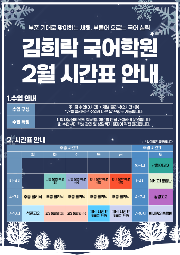 안녕하thㅔ요!! 김희락 국어학원입니다 ㅋㅋ 1월이...사라졌어? 방학의 절반이...사라졌다고? 동공지진이 나고 있을 여러분들의 모습이 눈에 선하군요 ㅋㅋ 맞습니다 2월! 2월은 봄방학도 있고! 민족 대명절 설날도 있고! 새뱃돈도 받고 여튼 바쁜 달이죠! 물론 공부도 해야 합니다...이제 학기 시작까지 단 한 달! 열심히 달려야 하죠! 그런고로 2월 시간표 안내! 시작합니다! 2월에는 말씀드린 대로 목, 금 1-4시에 '현대 문학 특강'을 실시합니다! 이번주에 개학이 끼어 있는 친구들은 4-7시에 보강 진행할 거구요 ㅎㅎ 또 가장 핫한 파트가 바로 고1 내신반 개강 일정이겠죠? 고1 내신반은 목, 금 7-10시 / 토1-4시 이렇게 3타임에....... <img src="https://blogthumb.pstatic.net/MjAyNjAyMDNfNDMg/MDAxNzcwMTAwMTM3Mzg5.i6Dix5VLK-VV94V6XexeOgLt5aOSWUPvGiIsjrdUz_Ag.NywsjiNGIX9wAj4skZZ-WcVqwD0O40BuW24R8iT7dRcg.PNG/2026%B3%E2_2%BF%F9_%BD%C3%B0%A3%C7%A5.png?type=s3" />