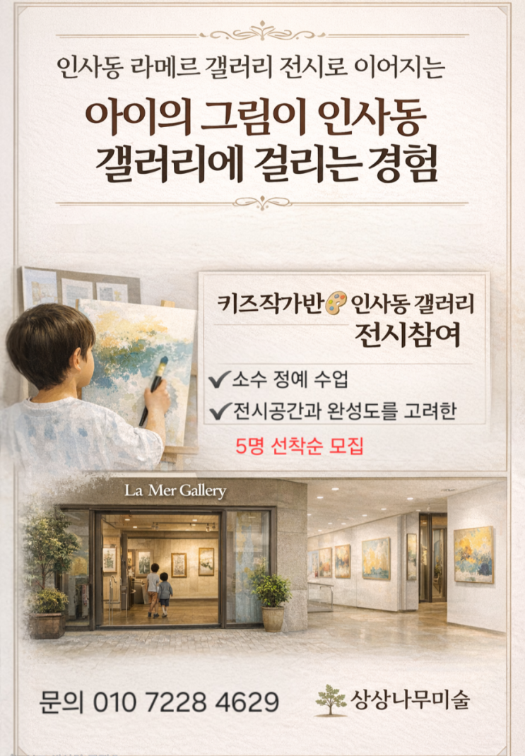 안녕하세요. 상상나무미술 김경하입니다. 저희 상상나무미술은 매년 '인사동'에서 아이들의 전시회를 진행하는데요. 이번에도 아이들 전시를 '라메르갤러리'에서 진행합니다.♀️ 아이의 그림, 집안 곳곳 벽이나 냉장고에 붙이기만 하시는 부모님들은 주목해주세요. 이번 키즈 작가반은 단순한 미술 수업이 아닙니다. ‘라메르 갤러리 전시’를 목표로 기획 → 제작 → 완성 → 전시까지 하나의 작품 여정을 경험하는 프로그램입니다. ✔ 전시 공간을 고려한 작품 구성 ✔ 완성도를 끝까지 끌어올리는 지도 ✔ 소수 정예 수업으로 아이 개별 집중 아이 스스로 “내 그림이 전시에 걸렸다”는 경험은 자신감과 자존감....... <img src="https://blogthumb.pstatic.net/MjAyNjAyMDhfNDQg/MDAxNzcwNTU5ODYzOTEz.esIcAuOHKqfzK0XGMWYffdGy4d4K48rAEZf52Pyqjvsg.3OQsknR47k-EQA4dZ5AxyV7nYevZWL9b9sUTdyPwieMg.PNG/900%A3%DFChatGPT_Image_2026%B3%E2_2%BF%F9_7%C0%CF_%BF%C0%C8%C4_11%A3%DF49%A3%DF25%A3%A81%A3%A9%A3%A81%A3%A9%A3%A81%A3%A9%A3%A81%A3%A9%A3%A81%A3%A9%A3%A81%A3%A9.png?type=s3" />