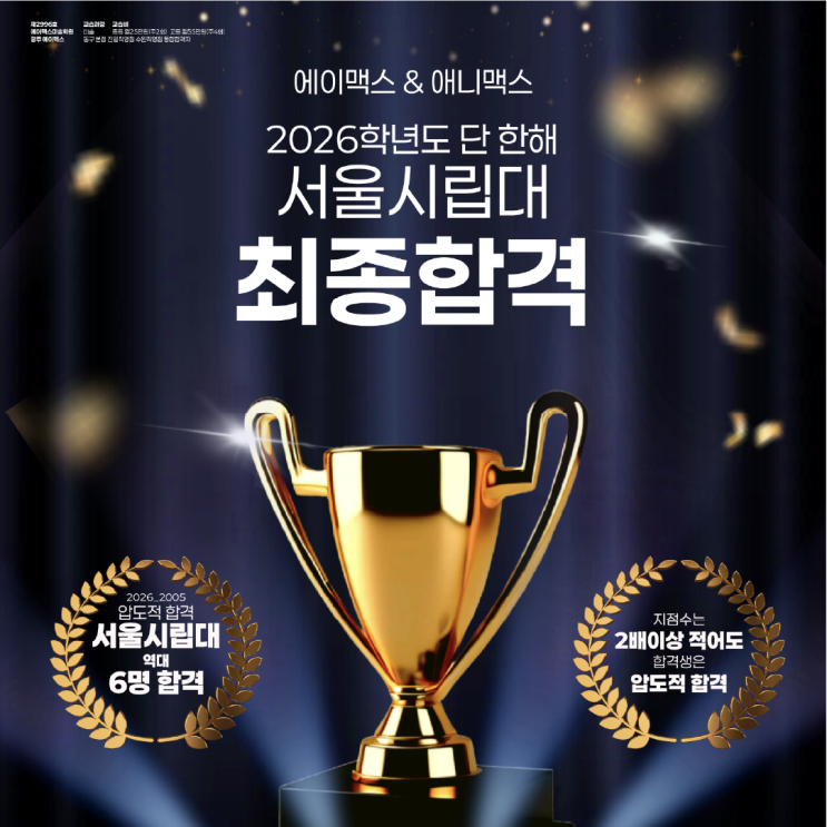 [에이맥스 미술학원] 2026학년도 에이맥스 서울시립대학교 최종 합격자를 공개합니다~! [광주입시 미술학원] 안녕하세요! 에이맥스 미술학원입니다~ 지난해 시작된 수시 전형을 시작으로, 최근 정시 전형까지 숨 가쁘게 달려온 2026학년도 입시 대장정이 드디어 그 화려한 막을 내렸습니다!!! 그동안 열심히 입시 준비하시느라 정말 수고 많으셨습니다 앞으로 재미있는 대학 생활이 기다리고 있겠네요 (˶ᵔ ᵕ ᵔ˶) 지금부터 저희 에이맥스 미술학원의 2026학년도 최종 합격 결과를 공개해 보겠습니다!!!! 서울시립대학교 최종 합격 올해 서울시립대학교에 <조각학과>라는 전공에서 좋은 성적을 만들어내어 최종 합격하였습니....... <img src="https://blogthumb.pstatic.net/MjAyNjAzMDdfMTY3/MDAxNzcyODU3OTQ0MzU5.VWylT-YirywUWEQEKdkCC37KoD_-7EdWIL0gTPm_i9Mg.hA_4fGwJ6OPq6ktkD2-682ArOaX0pmX0y_2tMu_9Legg.PNG/%BF%A1%C0%CC%B8%C6%BD%BA_%C0%FC%B3%B2%B4%EB_%C7%D5%B0%DD%BB%FD_%BC%AD%BF%EF%BD%C3%B8%B3%B4%EB.png?type=s3" />