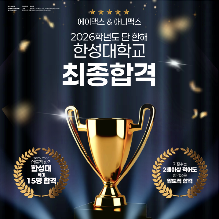 [에이맥스 미술학원] 2026학년도 에이맥스 한성대학교 최종 합격자를 공개합니다~! [광주입시 미술학원] 안녕하세요! 에이맥스 미술학원입니다~ 지난해 시작된 수시 전형을 시작으로, 최근 정시 전형까지 숨 가쁘게 달려온 2026학년도 입시 대장정이 드디어 그 화려한 막을 내렸습니다!!! 그동안 열심히 입시 준비하시느라 정말 수고 많으셨습니다 앞으로 재미있는 대학 생활이 기다리고 있겠네요 (˶ᵔ ᵕ ᵔ˶) 지금부터 저희 에이맥스 미술학원의 2026학년도 최종 합격 결과를 공개해 보겠습니다!!!! 한성대학교 최종 합격 올해 한성대학교에 <동양화>라는 전공에서 좋은 성적을 만들어내어 최종 합격하였습니다! 이처럼 압도....... <img src="https://blogthumb.pstatic.net/MjAyNjAzMDZfNyAg/MDAxNzcyNzczMzgyNjYy.MpH57Jl5wEKq6bOM2zzr1henFdGAXiwDtNcD109CMf8g.HIpAue8TvCpYcdhIO_8hRmNvZj35xy3dEeVXydbWR1kg.PNG/%BF%A1%C0%CC%B8%C6%BD%BA_%C0%FC%B3%B2%B4%EB_%C7%D5%B0%DD%BB%FD_%C7%D1%BC%BA%B4%EB.png?type=s3" />