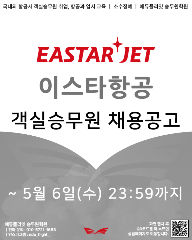 안녕하세요 에듀플라잇 승무원학원입니다. 이스타항공의 2026년 3차 객실 승무원 채용공고입니다. 어제 이스타 최종면접이 끝났는데 바로 채용 공고네요 ! 2명의 학생들이 노멀하지 않았던 :) 최종면접을 마치고 결과를 기다리고 있습니다 지원자격 TOEIC 670 또는 TOEIC Speaking IM3 또는 OPIc IM2이상 기 졸업자 및 2026년 8월 졸업 예정자 우대요건은 간호학과 전공자 및 관련 자격증 보유자 외국어 능력 우수자 (일본어, 중국어, 러시아어) 가 있습니다. 전형 절차 및 일정 접수 기간: 2026.04.29.(수) ~ 05.06.(수) 23:59 서류 접수 기간이 일주일로 비교적 짧습니다. 꼼꼼하게 확인하고 제출하셔야 겠습니다. 서류전형 → 상황대....... <img src="https://blogthumb.pstatic.net/MjAyNjA0MjlfMTMx/MDAxNzc3NDQ5MzQ5MTAx.dVD55nYyW_sjE-5Q6KOsSBgmRZPheTzPgwUO7vmxW2sg.78D33NKXekJJFH7oiUzILH3Ll4dQNLm4qYkR13wIEoMg.PNG/image.png?type=s3" />