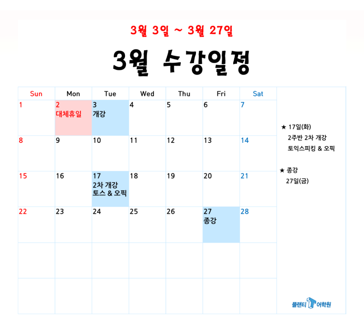 #토익 #토익스피킹 #오픽 #토익온종일반 #토스2주반 #오픽2주반 새해가 된지 얼마 안 된 것 같은데 벌써 3월 새학기가 다가오고 있어요~~ 새로운 마음가짐으로 영어공부는 언제나 광주 NO.1 플랜티와 함께 Let's go reach your goal!! [강의 일정] 모든 수업은 월~금 평일은 다 진행됩니다. 3월 수업은 3일(화)에 시작해서 27일(금)에 끝날 거예요. 토익스피킹과 오픽 2주반은 매월 2회씩 개강해요. 1차 개강 : 3일(화) 2차 개강 : 17일(화) [강의 시간표] 플랜 토익은 LC & RC 수업 2시간 (+ 스터디 1시간) 으로 진행되고, 스터디는 개강 이후 신청하시면 무료로 할 수 있어요. 기본반은 2일차 수업 후 스터디 신청 실전반은 1일차 수....... <img src="https://blogthumb.pstatic.net/MjAyNjAyMDlfMjgy/MDAxNzcwNjAwNTg2NzU2.KXKDufEySq7FWnf9GWog0auDjQ8q3NZnnjcGL-oA0Esg.Z8BFFMSaxTxwjvoJXdEMuA5DybtoLywzpwGpi_HeXbsg.PNG/3%BF%F9_%B0%AD%C0%C7%C0%CF%C1%A4.png?type=s3" />