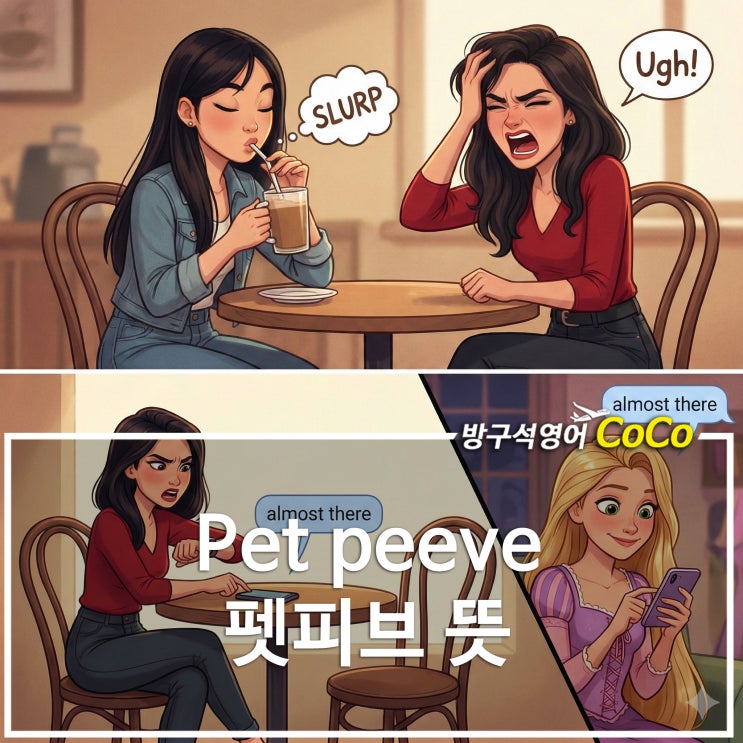 안녕하세요, 우리 잇님들! 오늘도 여러분의 영어 실력을 레벨업 시켜드리기 위해 찾아왔습니다. 자, 여러분 솔직히 말해봅시다. 살다보면 '아... 진짜 저거 참을수 없다' 싶은 순간, 다들 있죠? 영화관에서 뒷 사람이 의자 툭툭 찰때 친구가 쩝쩝거리면서 밥 먹을때 엘리베이터 다 탔는데 닫힘 버튼 0.1초 만에 누르는 사람 볼때 막 엄청난 범죄는 아닌데, 나만의 '발작버튼'을 꾹 누르는 그 짜증 나는 포인트! 한국말로는 '아, 킹받네...' 혹은 '내가 제일 싫어하는거'라고 하죠? 이걸 영어 원어민들은 아주 찰떡같은 단어로 표현한답니다. 바로 Pet peeve(펫 피브)입니다! 오늘 이 표현, 아주 자....... <img src="https://blogthumb.pstatic.net/MjAyNjAyMTJfNzAg/MDAxNzcwODYxNDQwNjky.hEPWDLm5ofuyhkSckRqHfzauEy0QcHEgPfJjdsOiSaIg.MKCqJZPWI72xoYBvyX4eyY-7jR55MxIkKGwZCKcUHPUg.JPEG/%C6%EA%C7%C7%BA%EA%B6%E6petpeeve%C7%A5%C1%F6.jpg?type=s3" />