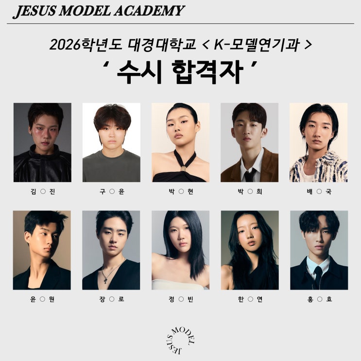 광주모델학원 / 광주모델아카데미 JESUS MODEL ACADEMY ㅣ 2026학년도 대경대학교 < K-모델연기과 > 수시 합격자 #광주모델입시 #모델입시 안녕하세요, 광주모델학원 지져스모델아카데미 입니다 :) 저희 지져스모델아카데미에서도 열정적으로 준비해온 입시반 친구들의 대경대학교 < K-모델연기과 > 기쁜 합격 소식이 전해졌습니다!! 노력한만큼, 멋진 결과를 얻는 만큼, 앞으로의 학교 생활과 모델 생활만큼 너무나도 기대가 됩니다! 자! 그럼 이제, 2026학년도 대경대학교 < K-모델연기과 > 수시 합격자를 함께 보러 가실까요? 설렘 가득한 소식, 바로 아래에서 확인해보세요 !!!!!!! 대학 입학을 시작으로, 저희 지져스모델....... <img src="https://blogthumb.pstatic.net/MjAyNTEyMDZfMjQ0/MDAxNzY0OTk3NzQ4Njcw.ly87OISNKNxj6hFyn5T6x7EBOE5e7kLLoAjntAS7W5Eg.5LOGAIUHB0zYoRpZmuOidB-Knwo80tBnS9Qy_E-cERwg.JPEG/2026_%B4%EB%B0%E6%B4%EB_%BC%F6%B1%E2.jpg?type=s3" />