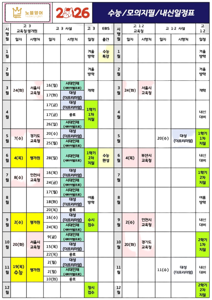 2026 수능·모의고사·내신 일정표 안내 안녕하세요, 노블영어입니다. 2026학년도 수능과 모의고사, 그리고 내신 대비 일정을 한눈에 볼 수 있는 통합 일정표를 안내드립니다. 이번 일정표는 ✔ 고3 교육청 모의고사 ✔ 사설 모의고사 일정 ✔ 고1·2 교육청 및 사설 일정 ✔ 수능 및 주요 학사 일정 까지 모두 정리되어 있어, 연간 학습 계획을 세우는 데 매우 유용합니다. 왜 일정표가 중요할까요? 수험 생활에서 가장 중요한 것은 시험 일정에 맞춘 장기적인 학습 계획입니다. 특히 고3의 경우 6월 평가원 모의고사 9월 평가원 모의고사 11월 수능 이 세 번의 시험이 입시에서 매우 중요한 기준이 됩니다. 따라서 각 시험 전 최소 4~6주 전부터 집....... <img src="https://blogthumb.pstatic.net/MjAyNjAyMTlfMjk3/MDAxNzcxNDY4ODE0ODEz.Z2sFBzNYb-9FLWklWOTK7LN8Gkd1kWqAMgZxMUgkcMYg.RX43rluxzumiYx3Il1uNcI76os8shLpay9A-QpKmWsog.PNG/%C1%A6%B8%F1%C0%BB_%C0%D4%B7%C2%C7%D8%C1%D6%BC%BC%BF%E4._%283%29.png?type=s3" />
