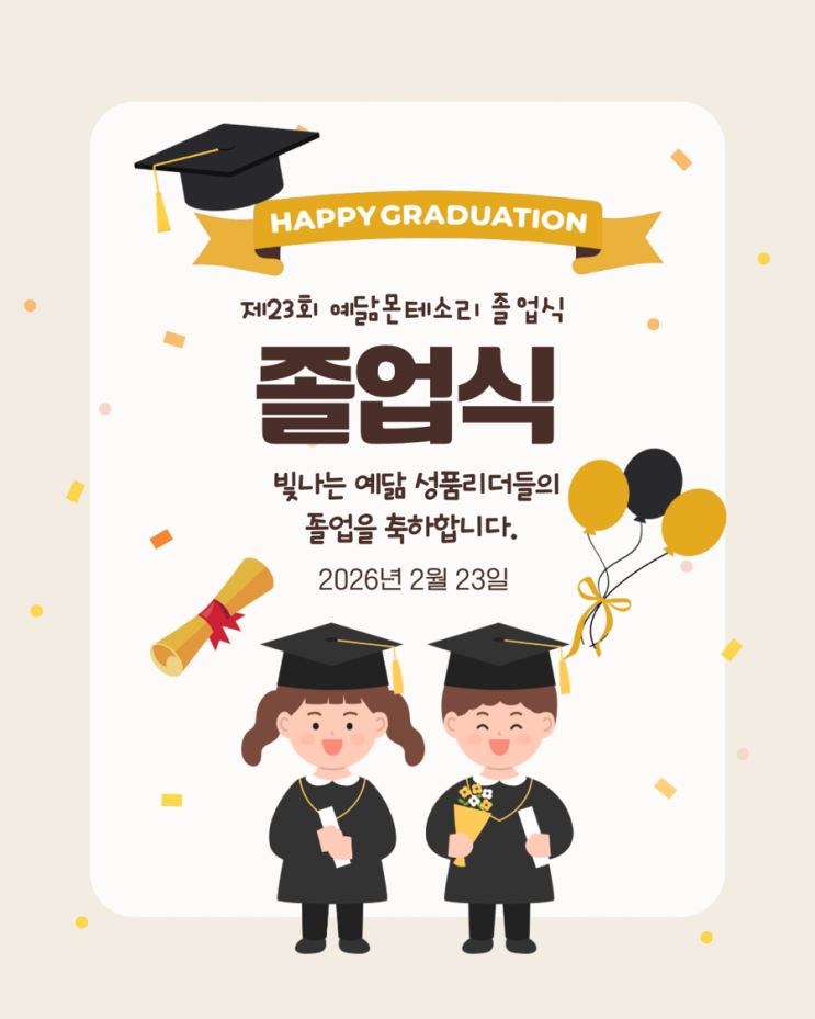 안녕하세요 사랑과 성품을 배우며 자라온 우리 예닮 몬테소리 유치원 졸업생들의 졸업식이 2026년 2월의 따뜻한 햇살이 가득한 날 진행되었습니다. 먼저, 졸업식이 어떻게 진행되었는지 함께 영상으로 만나보실까요? ^^ 유치원에서의 소중한 시간을 마무리하고 새로운 시작을 앞둔 우리 친구들의 반짝이는 시간이 곧 시작됩니다. 졸업식장으로 출발!!! GO GO ! 졸업식이 시작되기 전, 아이들이 하나둘 모여들었습니다. 설레는 표정으로 학사모 의상으로 갈아입으며 졸업식을 준비 하는 모습이 얼마나 사랑스럽던지요. 친구들과 함께 웃고 이야기하며 설레는 마음으로 졸업식을 기다리는 모습에서 유치원에서의 마지막 순간을 느낄 수 있었습....... <img src="https://blogthumb.pstatic.net/MjAyNjAzMTRfMjYx/MDAxNzczNDczOTI4MDcx.KXYcyP1uDBI7eqPcepEnkQl2V8QiZk04a7UXX8TX1cMg.7wzcunkzujviPbA6syRFLP5VuFf7olOYrMc5PZgPl0kg.PNG/%C1%A623%C8%B8_%BF%B9%B4%E0%B8%F3%C5%D7%BC%D2%B8%AE_%C1%B9%BE%F7%BD%C4.png?type=s3" />