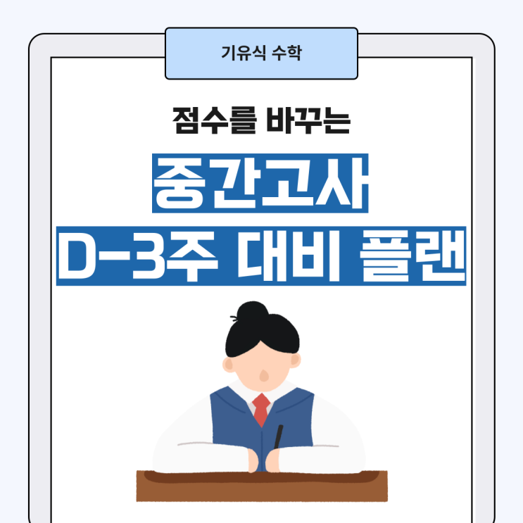 중간고사 점수 올리는 D-3주 대비 플랜! 안녕하세요! 광주 상무지구 수학학원 유식한 유식쌤입니다. 중간고사가 다가오면 많은 학생들이 이런 말을 합니다. "이번엔 진짜 열심히 해야지." 그런데 벌써 코앞으로 다가온 시험까지 남은 시간은 3주전! 오히려 문제풀이에만 급급하고, 계획없이 중구난방으로 준비하다보면 제대로 실력 발휘를 하지 못할 수 있습니다. ✅그래서 오늘은 중간고사 3주 전부터 확실하고 철저하게 대비할 수 있도록 D-3주 플랜을 준비했습니다. 그럼 지금부터 확인해볼까요? 1주차 : 개념의 허점을 찾아라 시험 3주 전, 가장 먼저 해야 할 일은 새 문제를 푸는것? NO 지금까지 배운 개념 중에서 흔들리는 부분....... <img src="https://blogthumb.pstatic.net/MjAyNjAzMzFfMTgy/MDAxNzc0OTU1MTAzMzc4.lv6MSjqMoKEEf0J1KnCXsyOoU6Wov6tqr1O1FL1tRFIg.UGebp1e54ne2mRcgM0bugu85EOGjlf1qYjPHTsgZ5_gg.PNG/%B1%E2%C0%AF%BD%C4-%BC%F6%C7%D0%C7%D0%BF%F8-020.png?type=s3" />