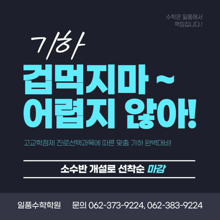 고교학점제 본격 도입이 된 이후 진로선택과목으로 기하라는 과목을 아이들이 처음 접하게 될텐데요. 평가방식에 따른 논란이 있었지만, 현재 별다른 뉴스가 없는 것으로 보아 이전 교육과정과 다르게 진로임에도 불구하고, 절대평가의 방식이 아닌 상대평가의 방식을 따르게 됩니다. 일반과목과 동일하게 등급제로 구분이 됩니다. 아이들이 대수, 미적분, 확통 정도는 선행으로 많이들 접하는 반면 기하라는 과목은 일반적인 학생들이 선행으로 접하기 쉽지 않습니다. 수학성적에 있어 걱정되고 두려운 부분들 일품에서는 이러한 부분들을 해소시켜드립니다. 기하 수업은 소수의 3~4개의 반만 개설이 되며 기존 재원생들의 수강인원도 있기 때문....... <img src="https://blogthumb.pstatic.net/MjAyNjAzMjNfMjQz/MDAxNzc0MjU2MDE0NzYw.pAkQCgxlfenI4EIRYr5IN3sjGoM8KlYvLFpvuyHUZZMg.kvi2LC9B-60aZzZ7WM1nosa_fM1Zw4AEnxBkfXbHH4Eg.PNG/%C1%A6%B8%F1%C0%BB_%C0%D4%B7%C2%C7%D8%C1%D6%BC%BC%BF%E4._%283%29.png?type=s3" />