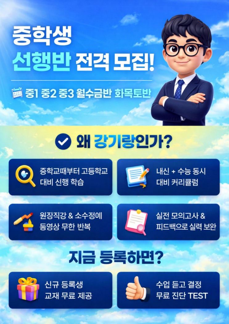 수업 먼저 듣고 결정하세요! 자신있습니다. 방문 상담시 학생이 레벨 TEST 볼 때 학부모님은 커피랑 빵 드시고 오셔요. (에뜰:담 커피&빵 쿠폰 무료 제공) 부모님만 방문하면 제가 시켜놓고 찾으러 갑니다. ^^ (원할한 상담을 위해 예약해주시면 감사하겠습니다.) 강기랑 영어 학원에 등록하기전에 먼저 1. 월수금반이나 화목토반 중에 어디가 나은지를 알려주세요. 2. 학생과 같이 온 학부모는 학생이 레벨 테스트를 보는 동안 기다리기 뭐하시니깐 학원에서 제공하는 무료 쿠폰으로 커피나 빵을 드시면서 기다리시면 됩니다. 3. 레벨 테스트 결과에 따라 내신반ㅣ선행반으로 반을 나누고 시강을 들어보고 결정하시면 됩니다. 레벨테스트 결....... <img src="https://blogthumb.pstatic.net/MjAyNjAzMjdfMjU3/MDAxNzc0NjA0NTQ5NTM2.PSFrl2X_l3KY-xlPcZsUclNCvLAIHGMmMAgpoegXglIg.llMfuQad3ws8XXz5Uh_MO1O05V3QLa8kgF0vwW4eXiQg.JPEG/%B0%AD%B1%E2%B6%FB-AI-001.jpg?type=s3" />
